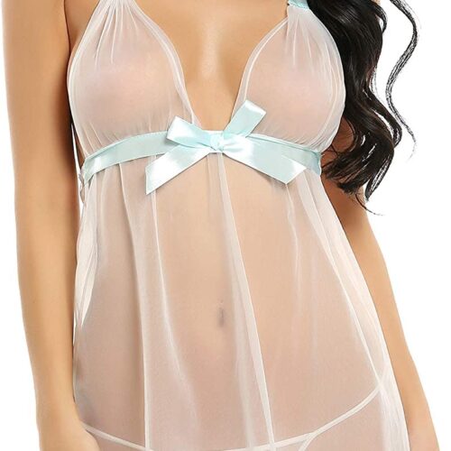 SSoShHub Premium Front Knot Open Babydoll Lingerie Bikini Swimwear Mini Chemise Mesh Wedding Bikini Nightie with Panty Bridal Dress Honeymoon Valentine Halloween Nightdress