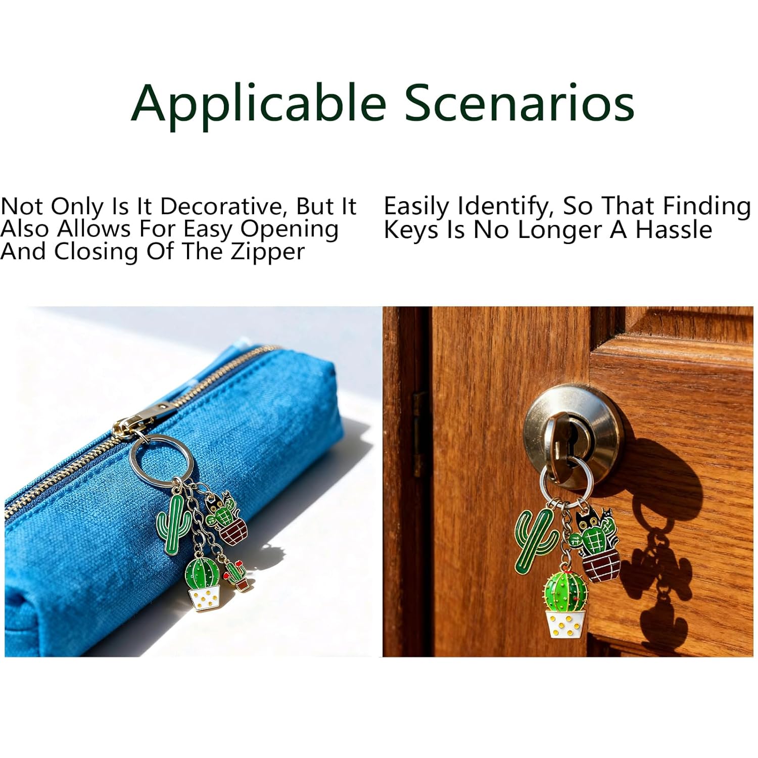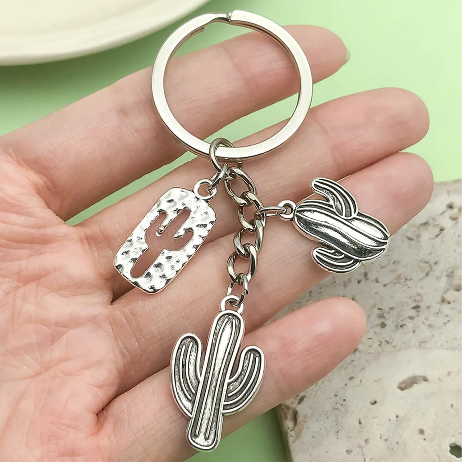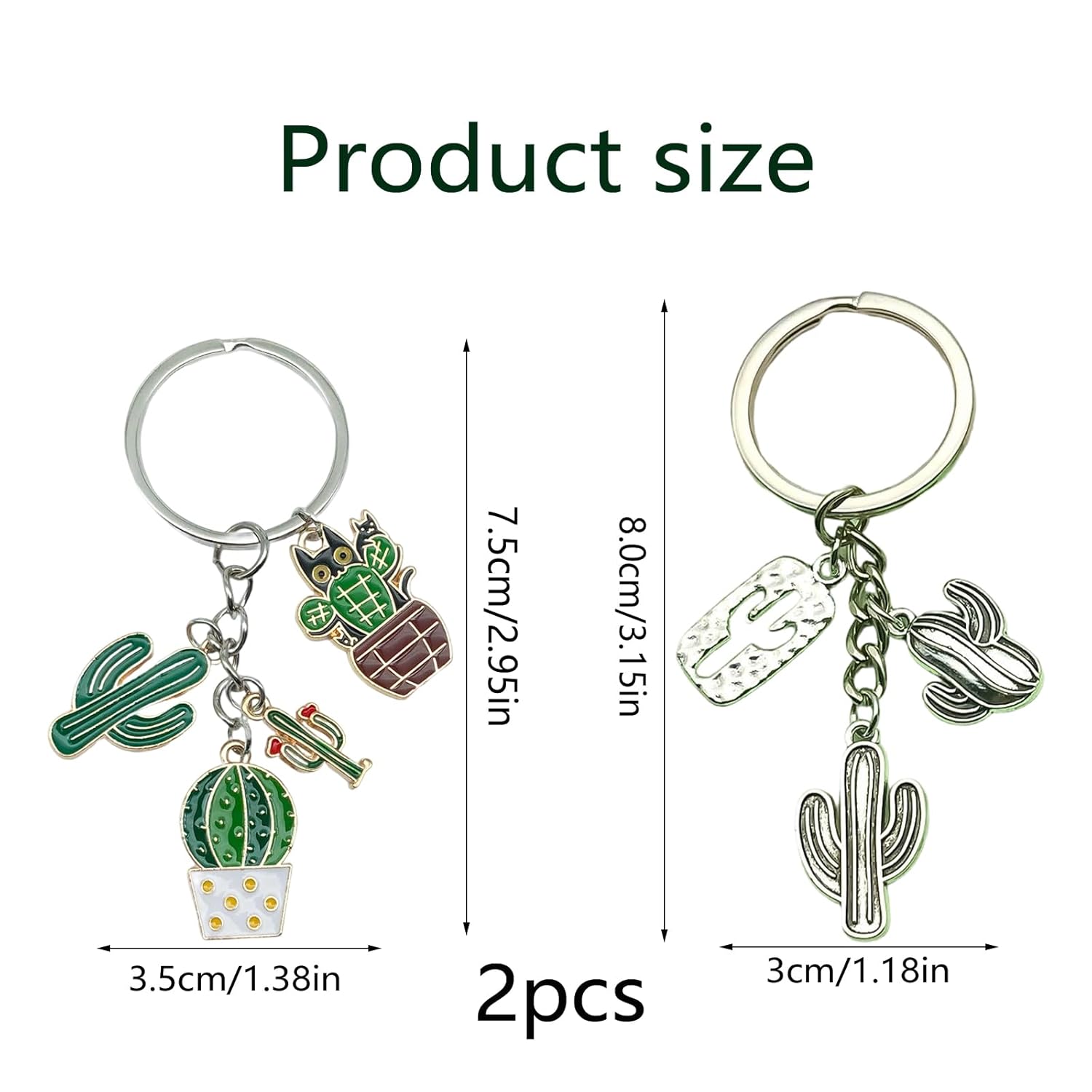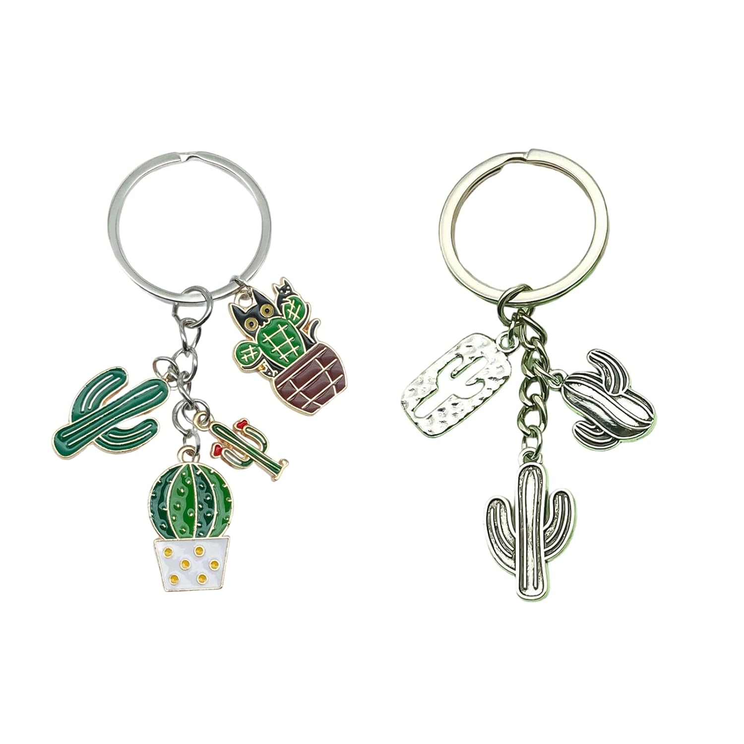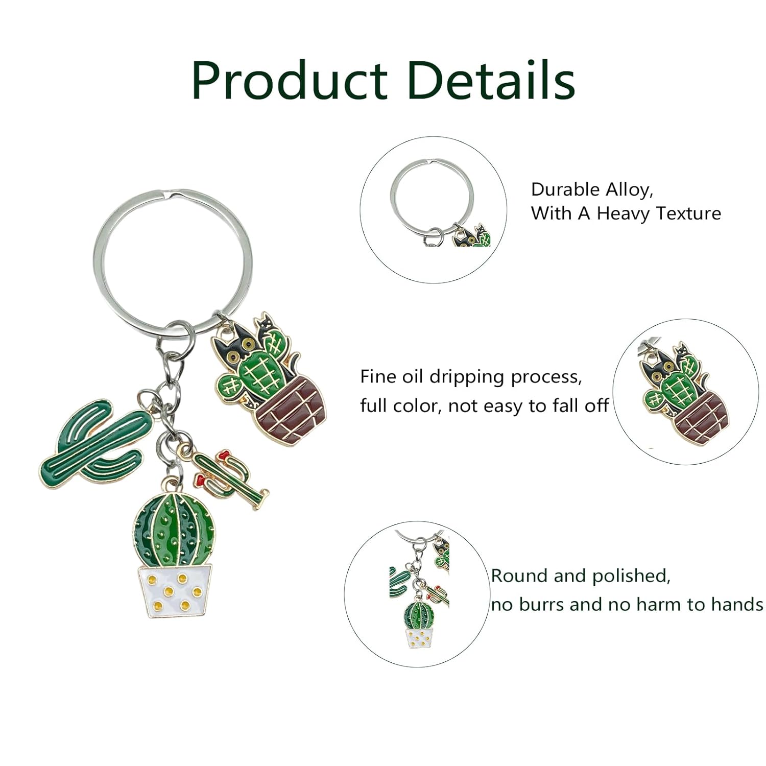 This adorable cactus and cat-themed keychain cleverly combines natural plant elements with soft and cute imagery, creating a fresh and sweet daily accessory. Made from high-quality alloy material and combined with delicate oil dripping techniques, the keychain brings the green hues of the cactus and the agility of the cat to life, with soft and lasting colors that are not prone to fading. The details are exquisite, with rounded edges and no sharp corners, making it lightweight, portable, and durable. Whether hung on a keychain for easy access, used as a unique identifier for backpacks or suitcases, or added to bags or car interiors, it adds a touch of playfulness and warmth to life. Its versatile design style is suitable for various occasions, conveying heartfelt messages whether for personal use or as a gift. Decorate every relaxing moment of the day with this vibrant keychain!