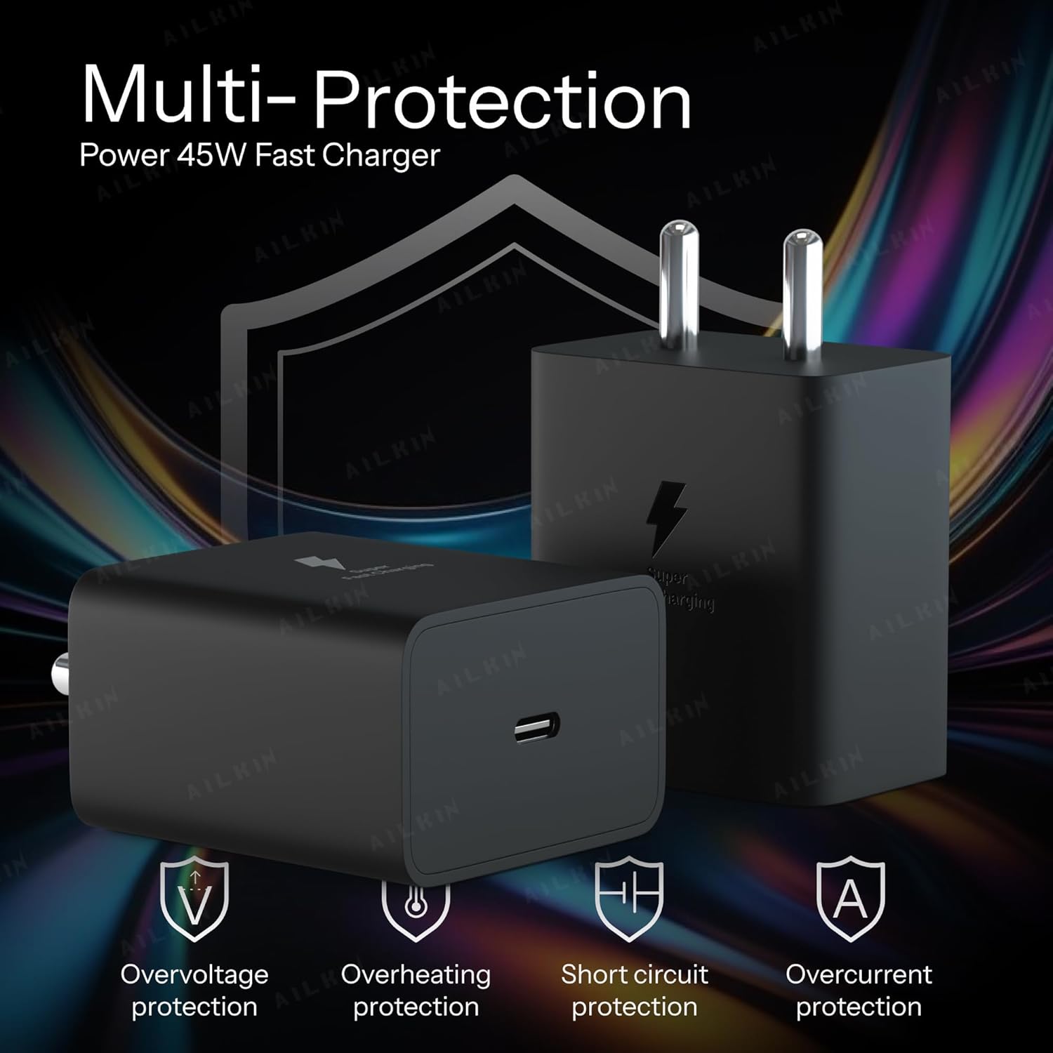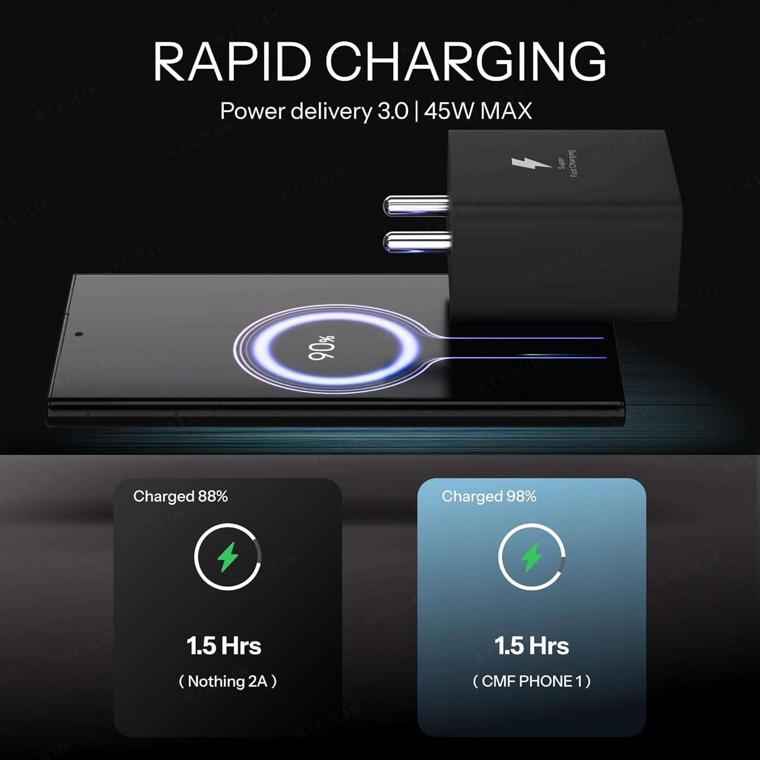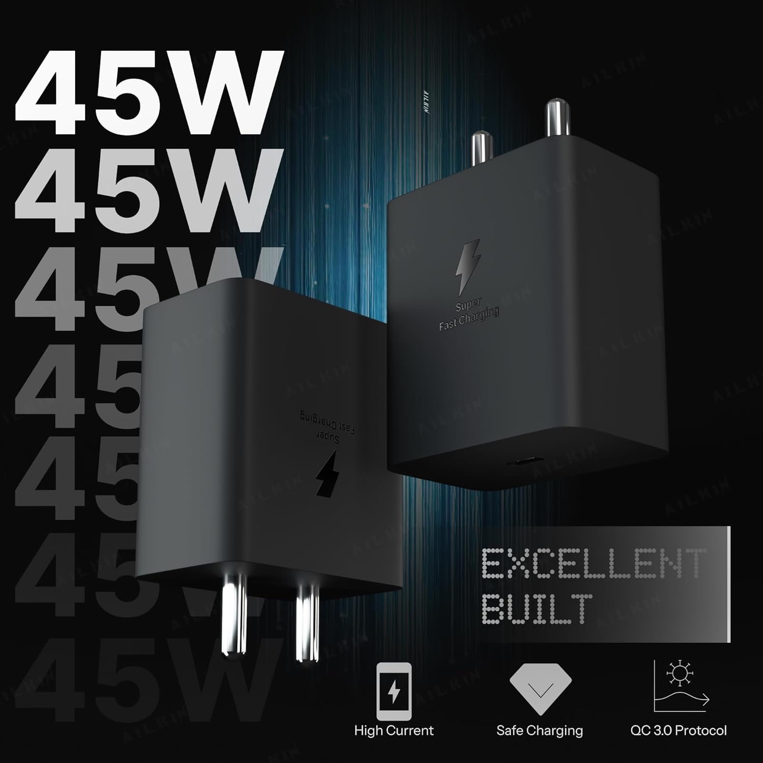 AILKIN 45W USB-C Superfast Charger Adapter with Cable Compatible with Samsung Galaxy S/A/M/F/Z Series-Compatible with S25/S24/S23/S22Ultra/S21/21FE/S20/Note/M54/M53 5G/M33/M23/A34/A54 5G & More(Black)