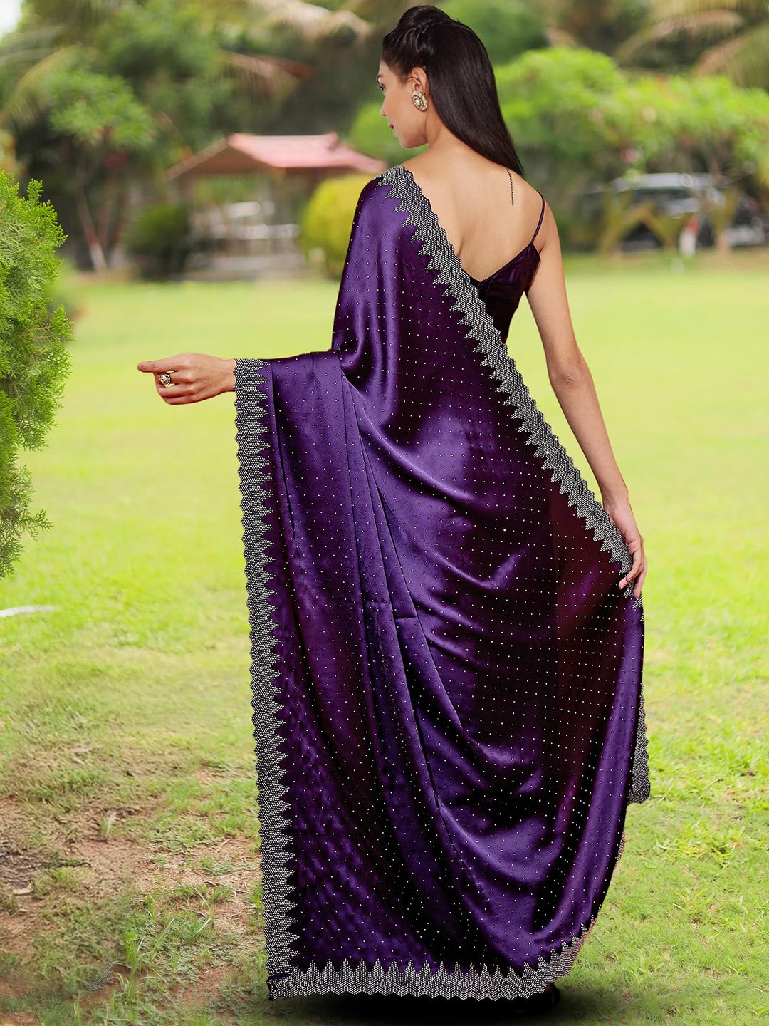 AKHILAM Women’s Satin Silk Hot Fix Solid Saree With Unstitched Blouse Piece