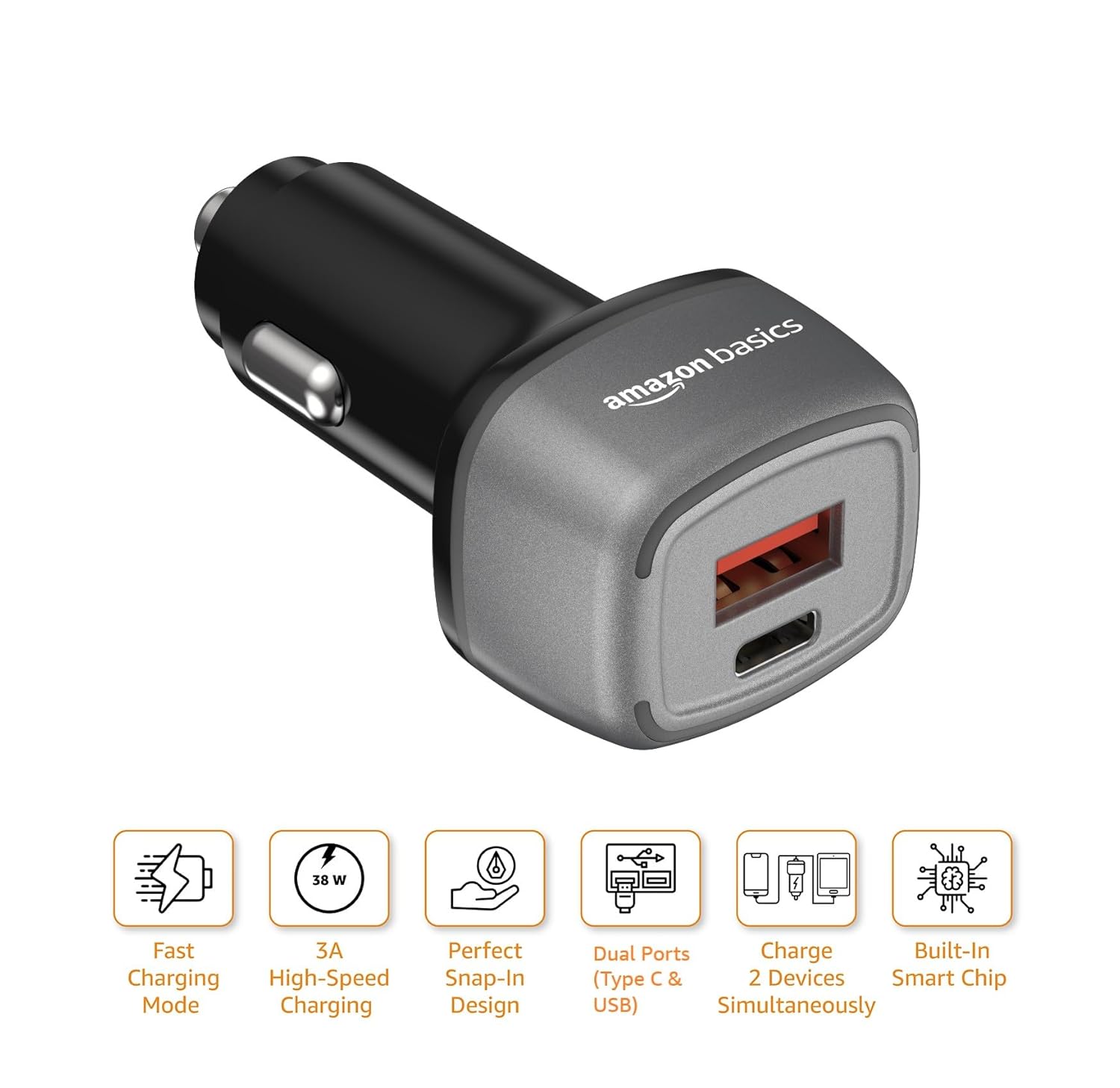 amazon basics Car Charger with 38W Charging| Cellular Phone Dual Port -Type C and USB Output | Type-C USB Cable Included, Black
