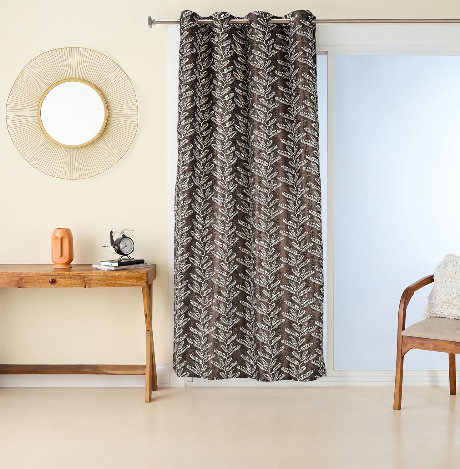 Leaf Print Cotton Curtains: These elegant curtains are crafted from soft cotton with a charming leaf print pattern to your space in a soothing coffee color palette.
