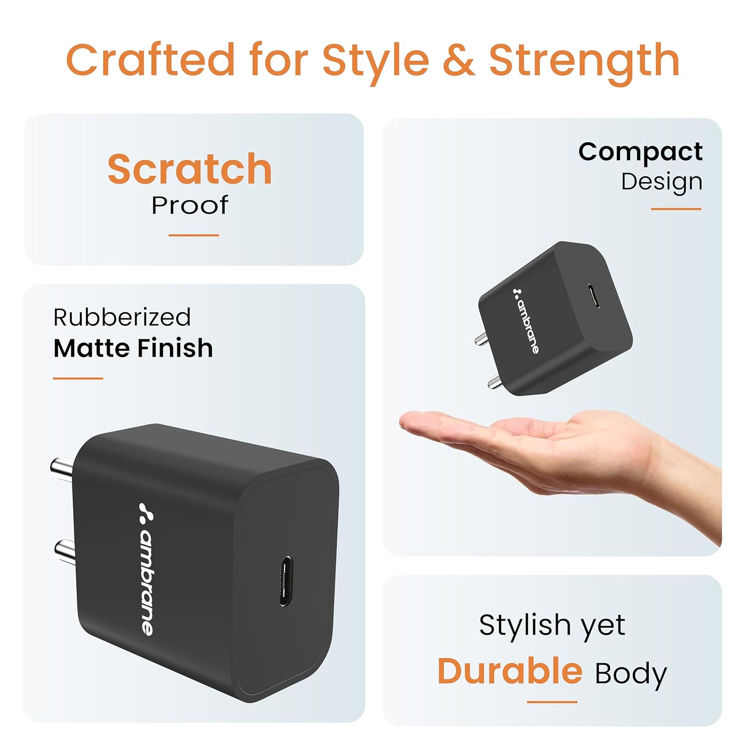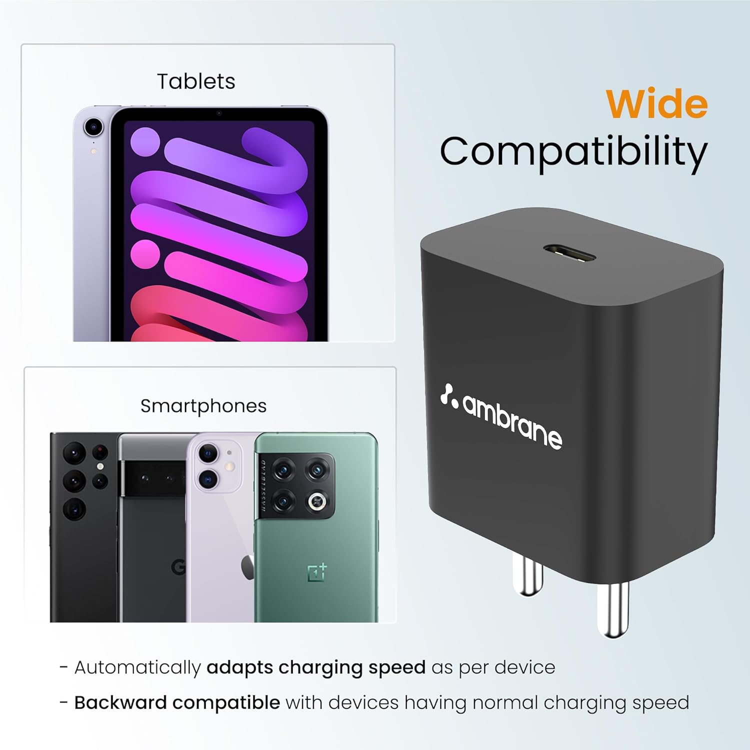 Ambrane 20W Mobile Charger Adapter with Lightning Cable || Fast Charging for Android, iPhone 14/13,13/12/11/X & Pro, Max Series & Other Type C Enabled Devices, PD Technology, BIS Certified (Raap M20)