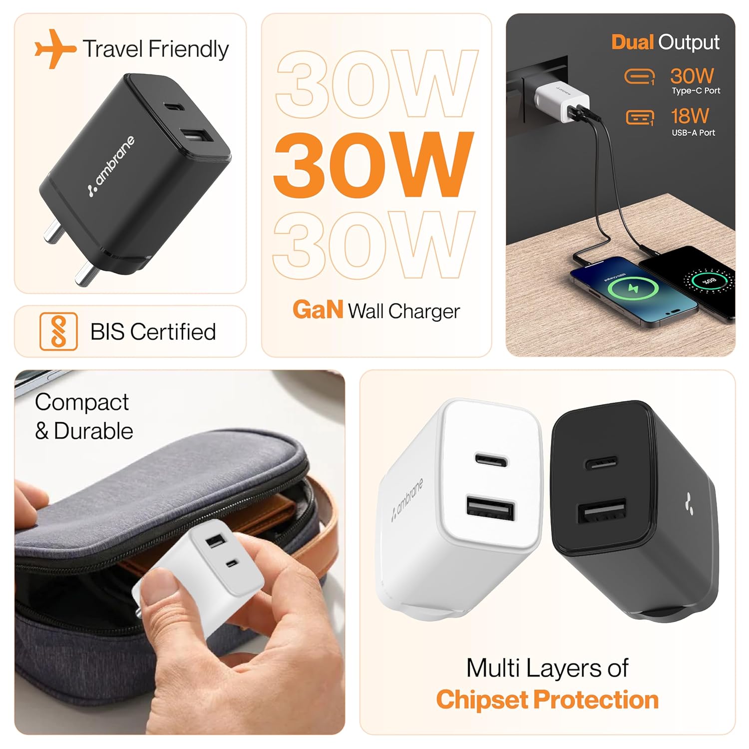 Ambrane 30W Dual Port GaN Charger, USB & Type C Fast Charging Adapter For iPhone 16/15/14/13/12/11 (Pro,Pro Max,Plus), iPad, Google Pixel, Samsung & All Type C devices BIS Certified (Charge 30, Black)