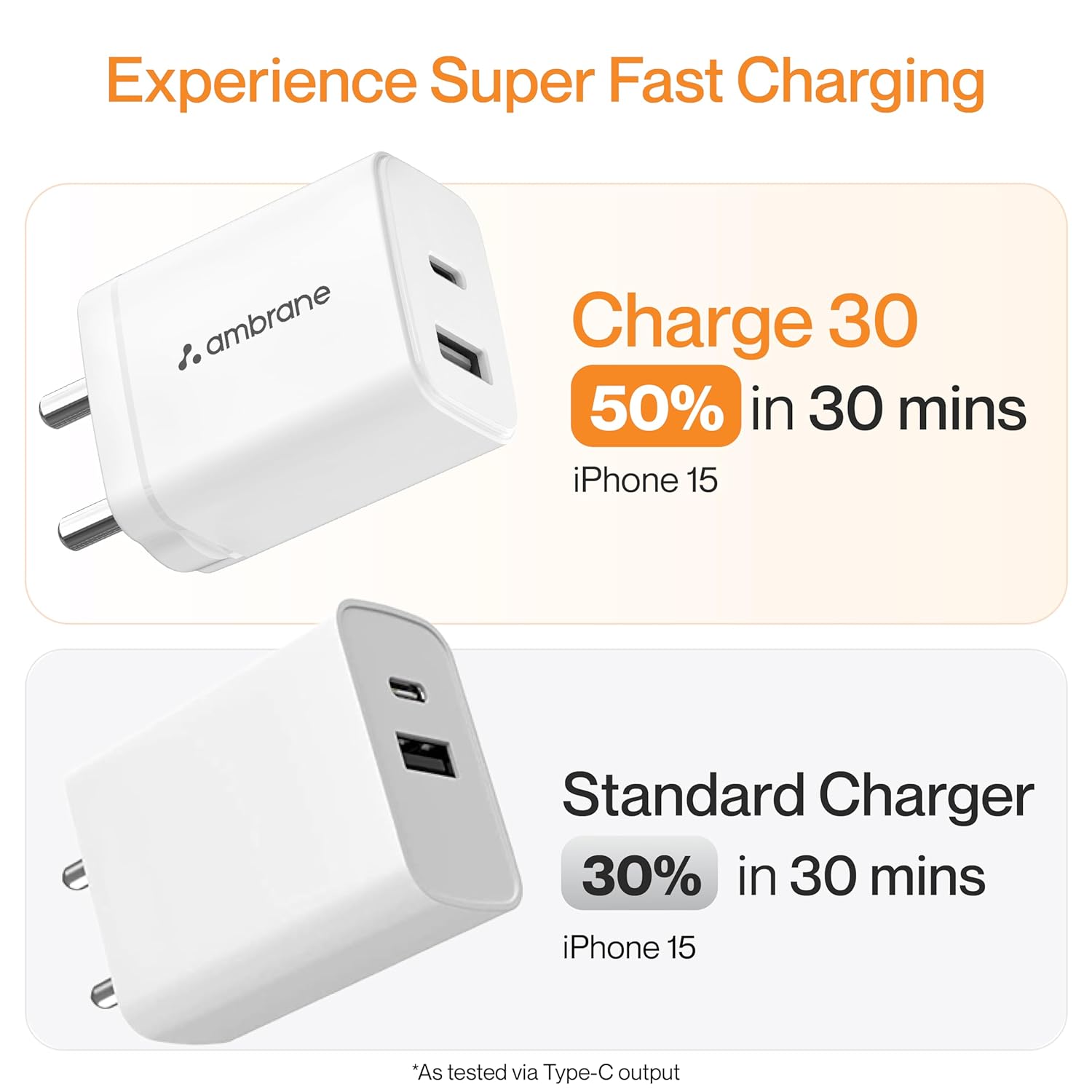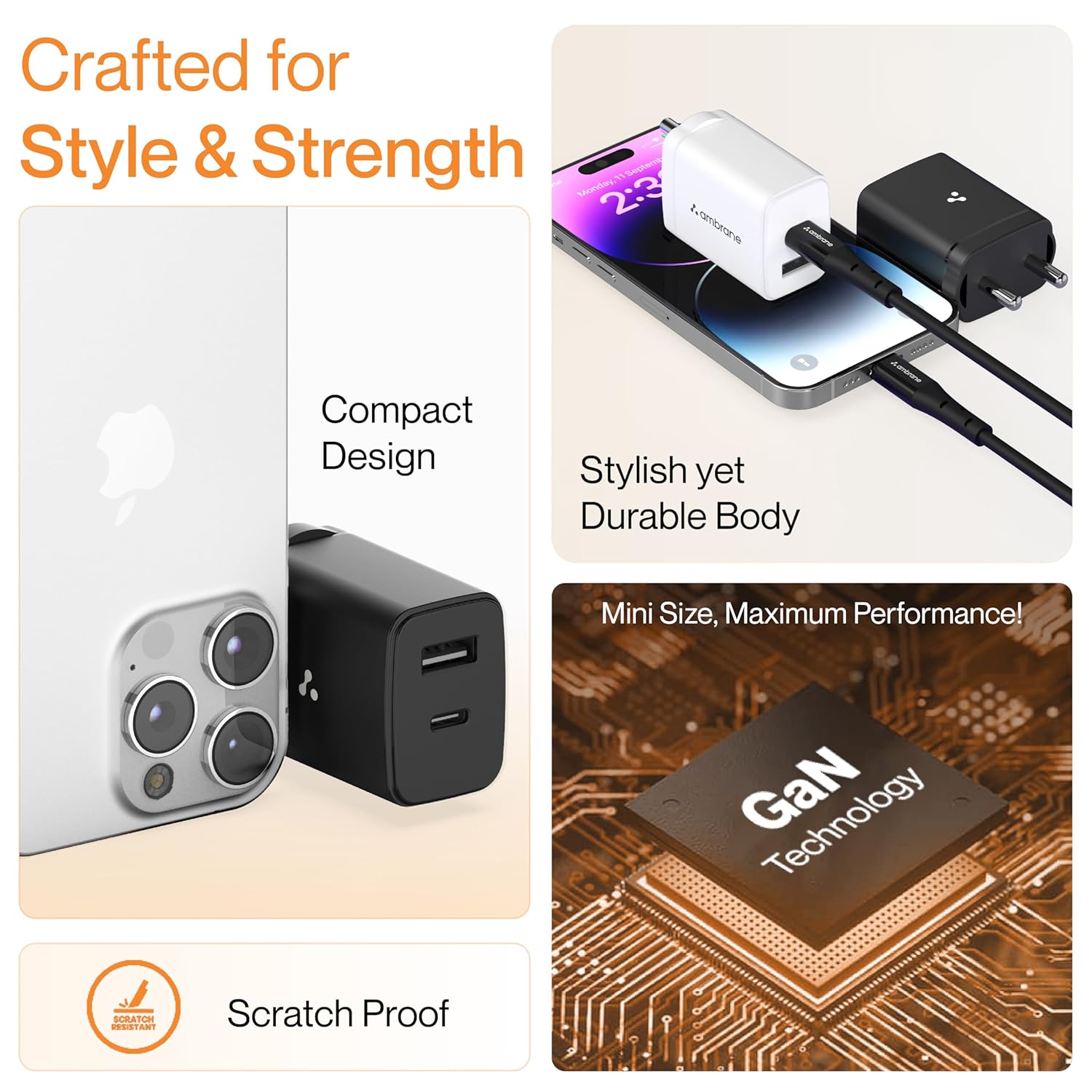 Ambrane 30W Dual Port GaN Charger, USB & Type C Fast Charging Adapter For iPhone 17/16/15/14/13/12/11 (Pro,Pro Max,Plus), iPad, Google Pixel, Samsung & All Type C devices BIS Certi. (Charge 30, White)