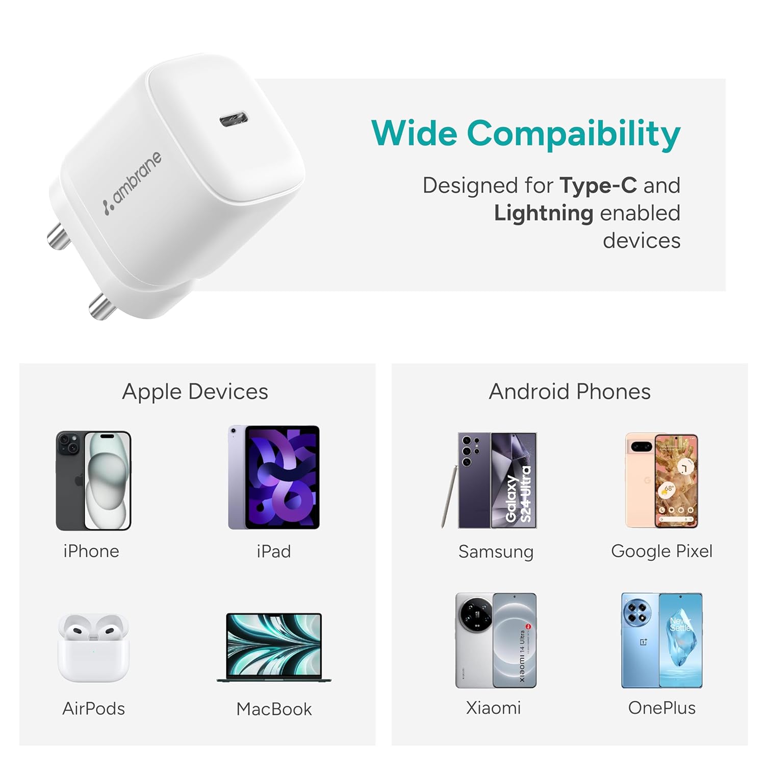 Ambrane 20W Type C Mobile Charger Adapter, Fast Charging for Android, iPhone 14/13,13/12/11/X & Pro, Max Series & Other Type C Enabled Devices, PD Technology, BIS Certified (Raap M20, White)