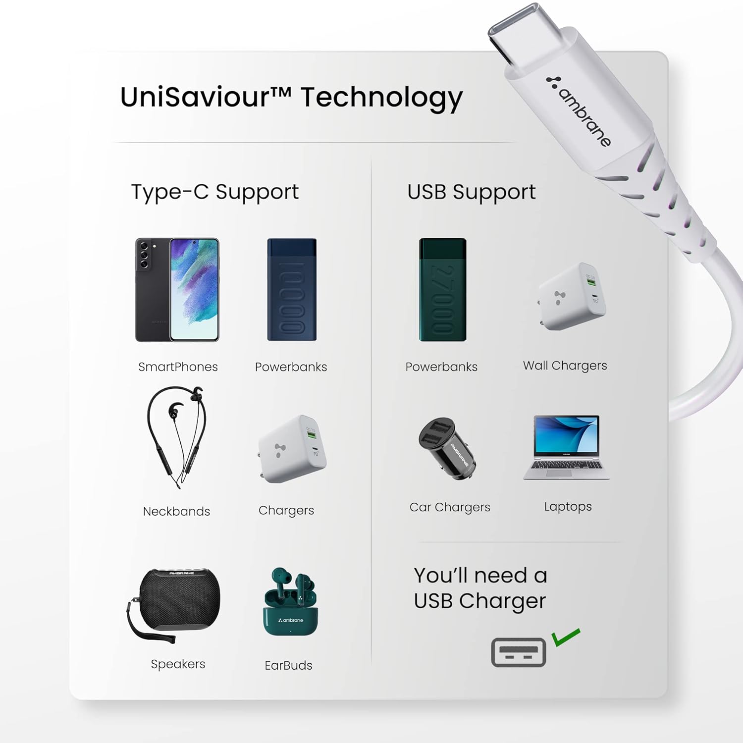 8 reviews for Ambrane 60W / 3A Fast Charging Output Cable with Type-C USB Cable to USB for Mobile, Neckband, True Wireless Earphone Charging, 480mbps Data Sync Speed, 1m Length (ACT – AZ10, White)
