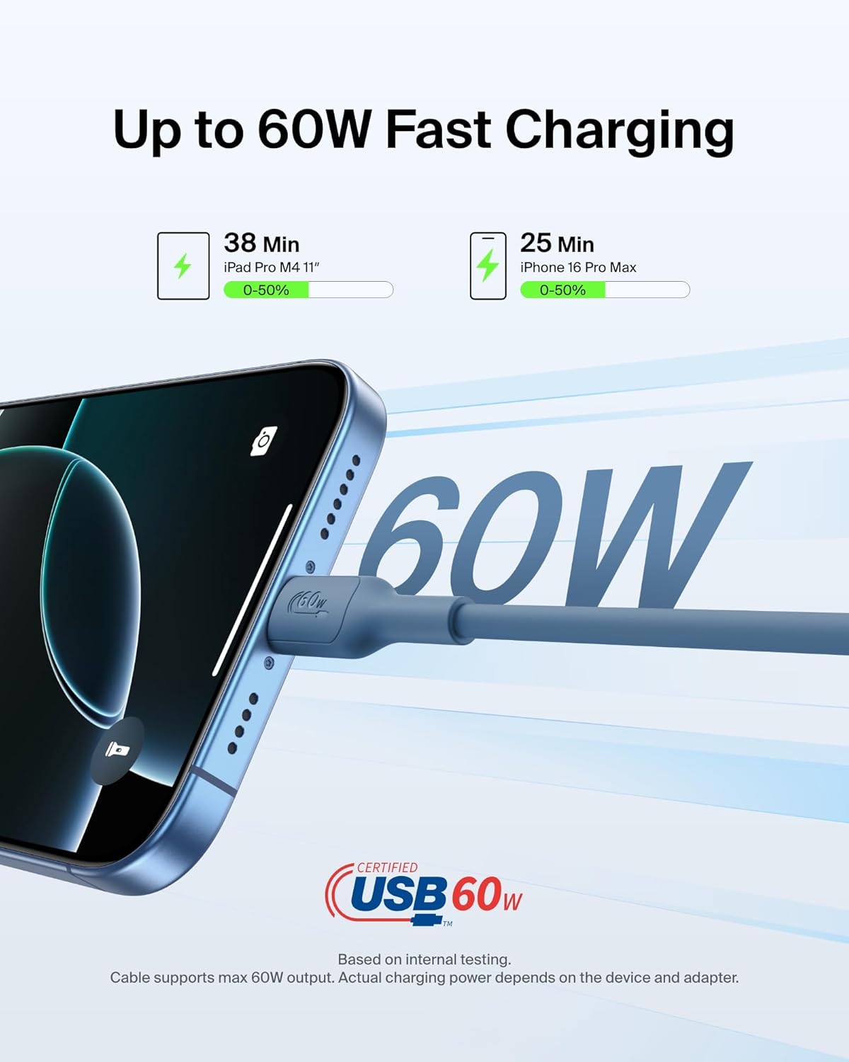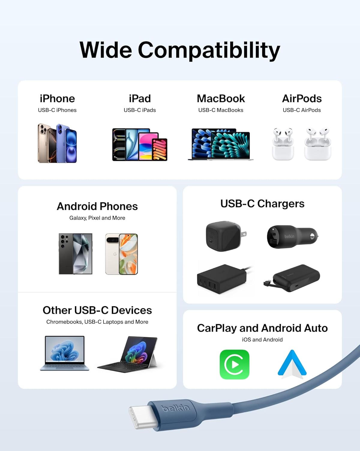 FAST CHARGING FOR YOUR DEVICES: The Belkin BoostCharge USB C Cable delivers 60W of power to fast charge your Apple iPhone 17 from 0-50% in as little as 25 minutes*, as well as charge a Samsung Galaxy S25, Google Pixel 10, and more at lightning speeds.
