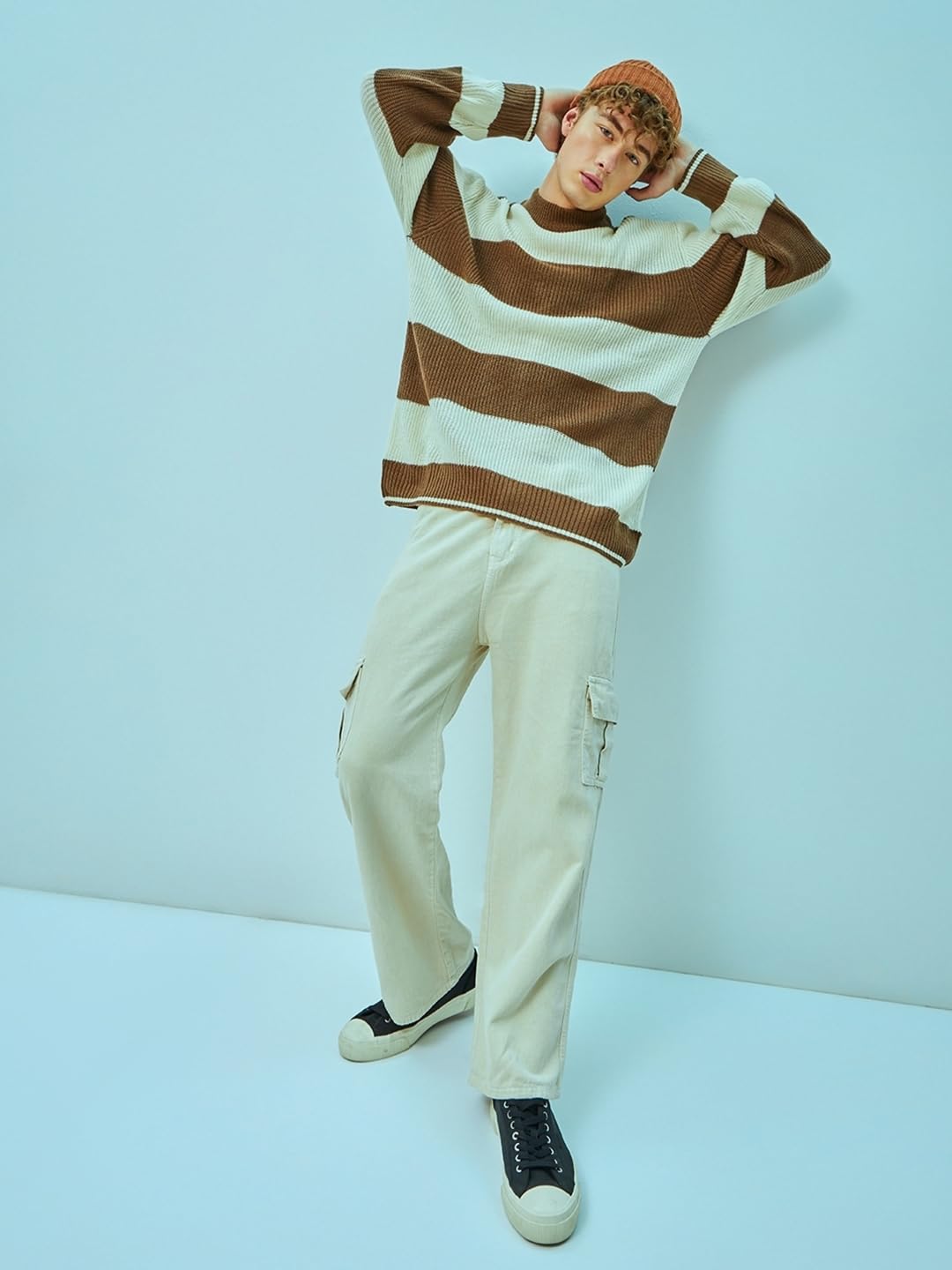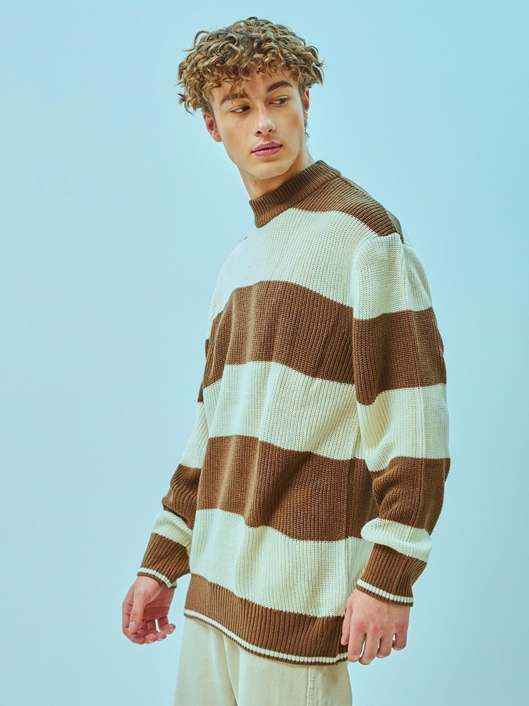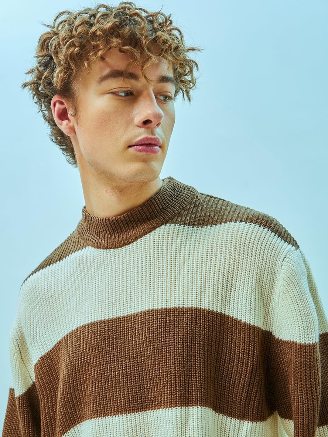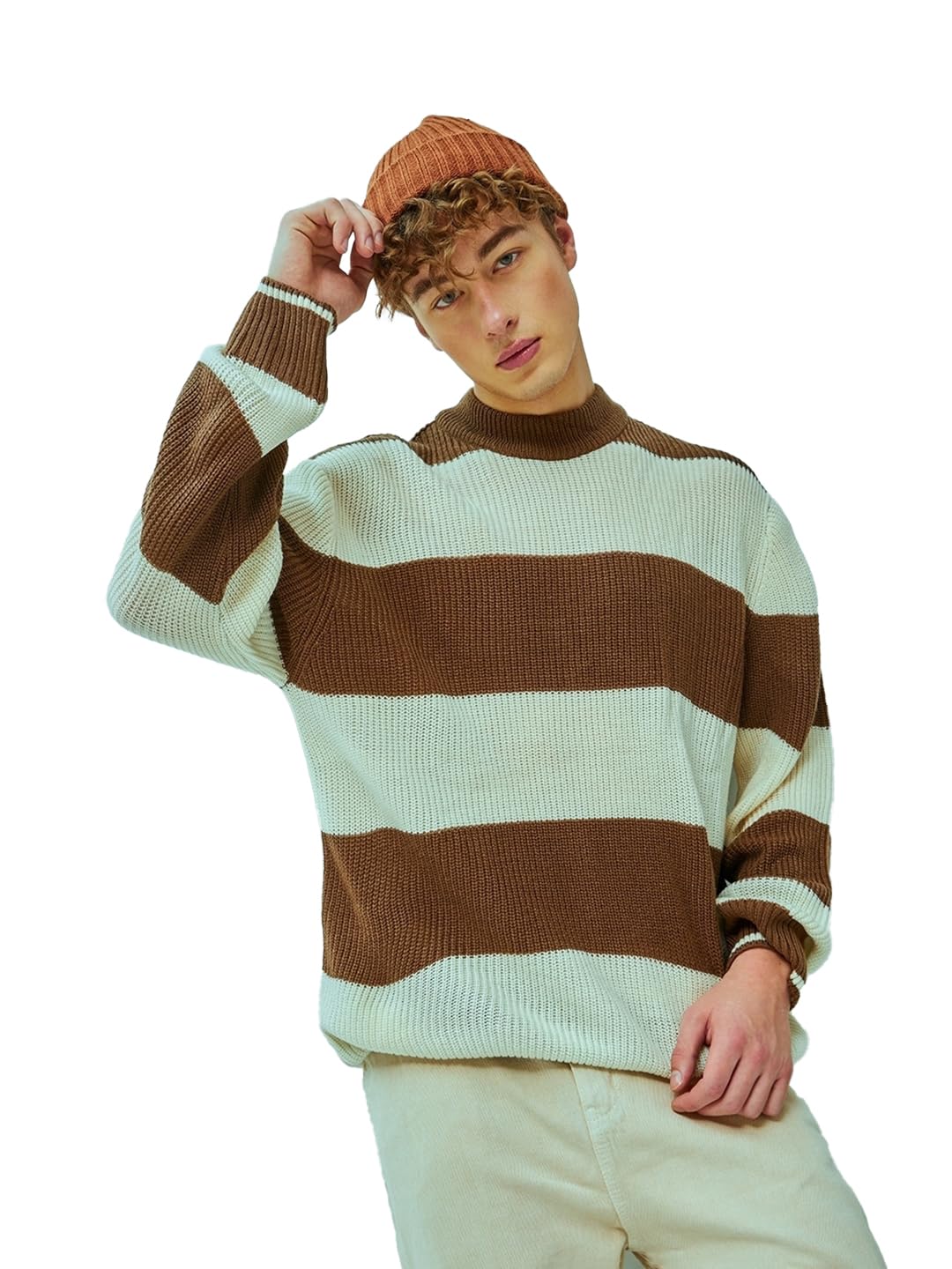 The Men’s Brown Color Block Flat Knit Sweater is your autumn companion. Style it with khaki pants and sneakers for an awesome fall appeal.