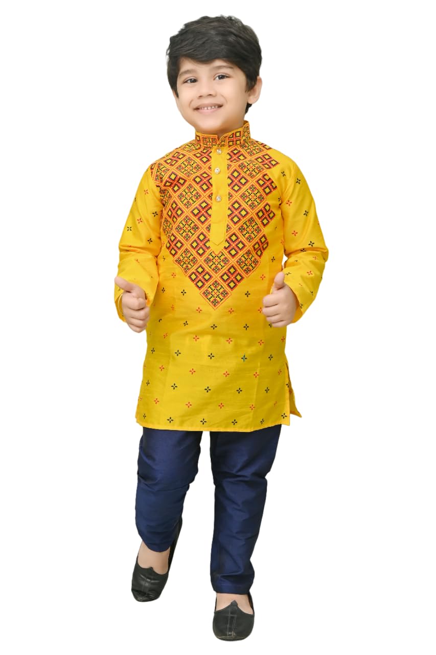 Boy’s Dupion Silk Ethnic Regular Printed Mandarin Collar Kurta & Pajama