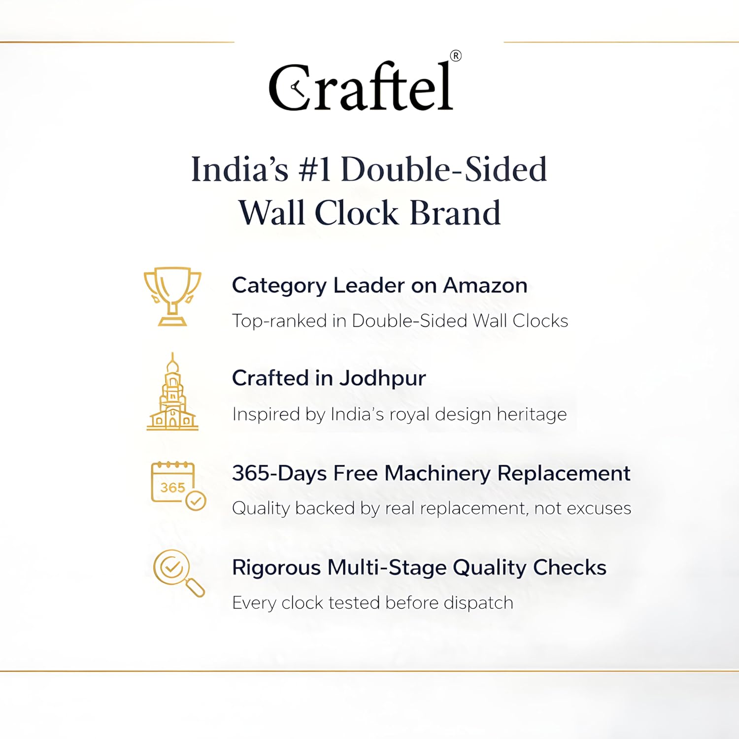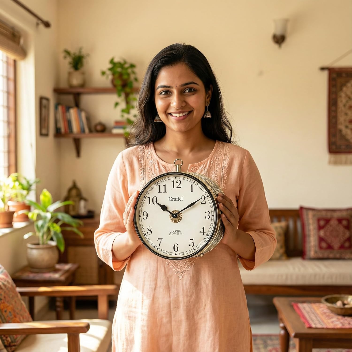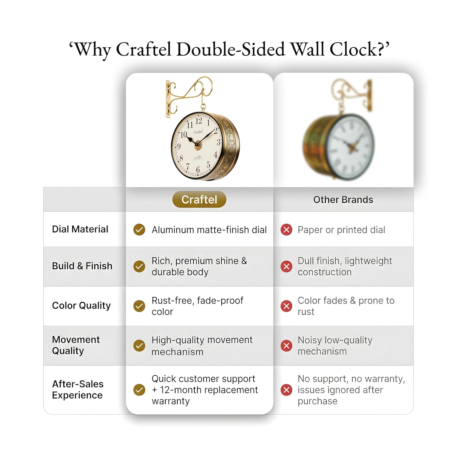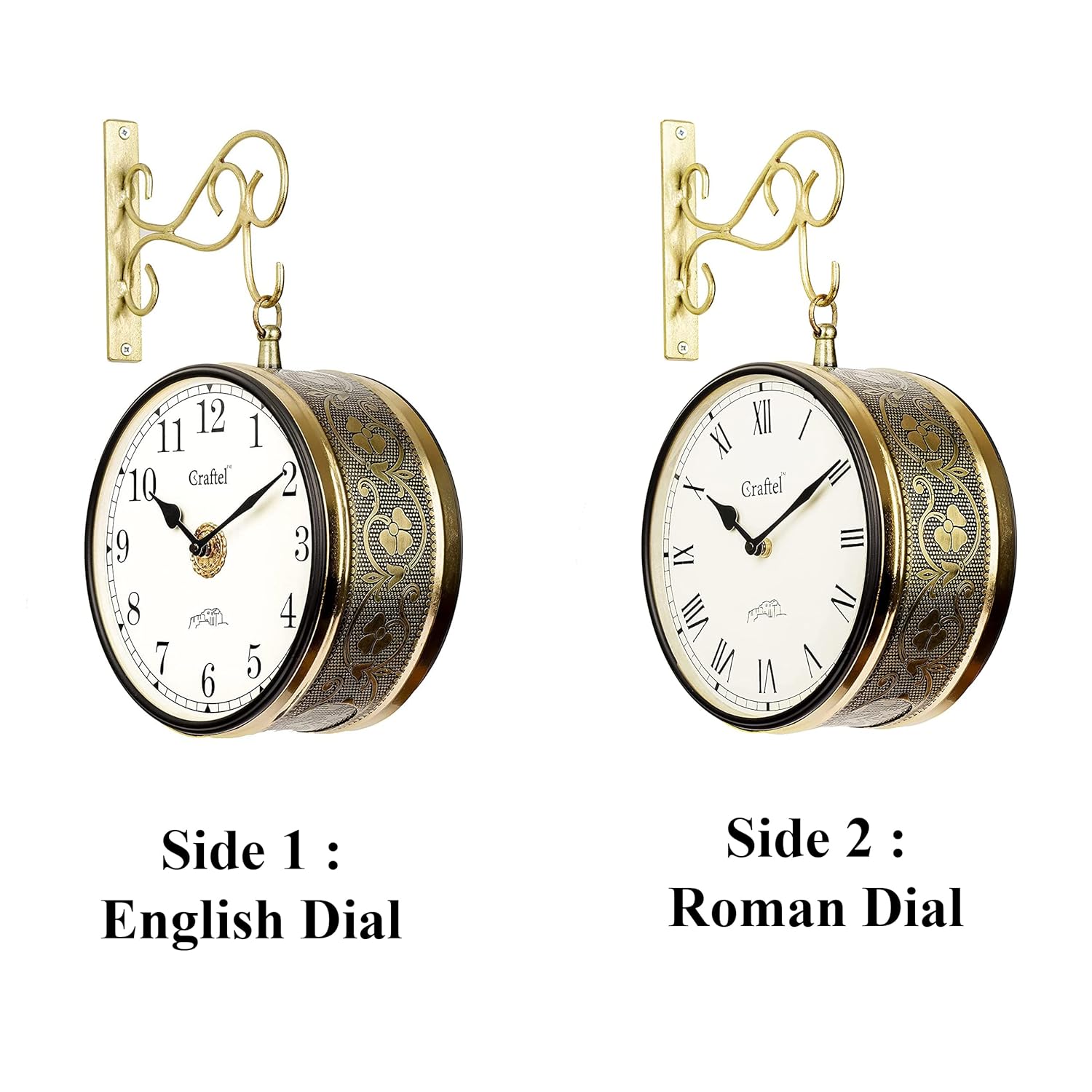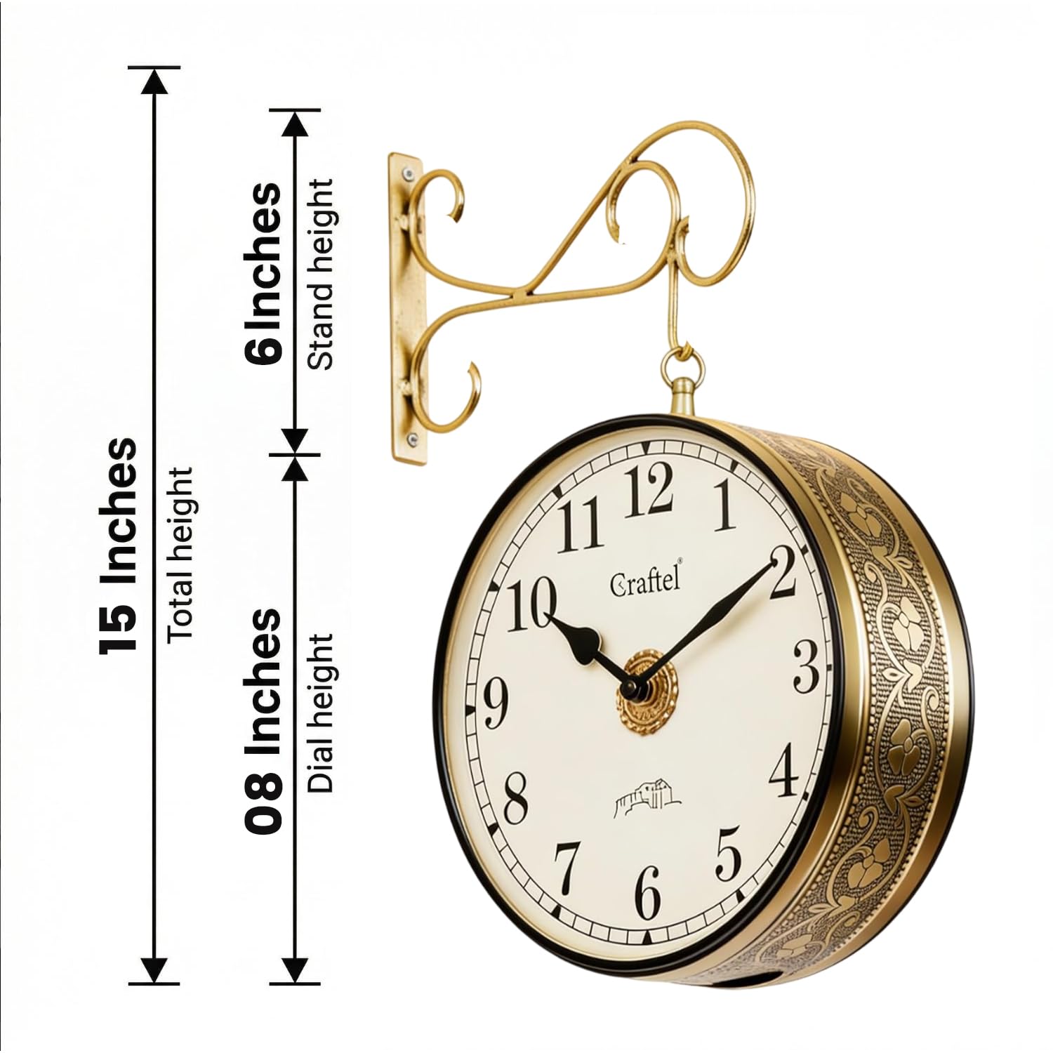 Elegant and Timeless Design – A Perfect Vintage Touch!I recently purchased this Craftel wall-mounted double-sided clock, and I must say it has exceeded my expectations in every way!✔ Premium Build Quality: The clock is made with high-quality metal and has a luxurious golden finish with intricate floral patterns on the sides. It feels solid and durable, ensuring long-term use.✔ Elegant Vintage Look: The design is absolutely stunning! It gives a classic, royal feel to the room and adds a touch of old-world charm. The detailed carvings and the hanging bracket make it look like something from a heritage property or a classic railway station.✔ Clear and Stylish Dial: The dual-sided feature is fantastic – both sides display time clearly, making it convenient to check from any angle. The bold black numbers on a white background make it easy to read even from a distance.✔ Smooth & Silent Operation: The clock runs quietly without any ticking noise, which is perfect for a peaceful environment.✔ Easy Installation: It was very simple to mount on the wall with the provided bracket. The hook design is strong and adds extra elegance.This clock is not just a timepiece, it’s a statement piece! It enhances the aesthetics of any living room, hallway, or office. If you love vintage décor or want to add a royal touch to your space, this is a must-buy product.Highly recommended for anyone who appreciates elegance, quality, and functionality.