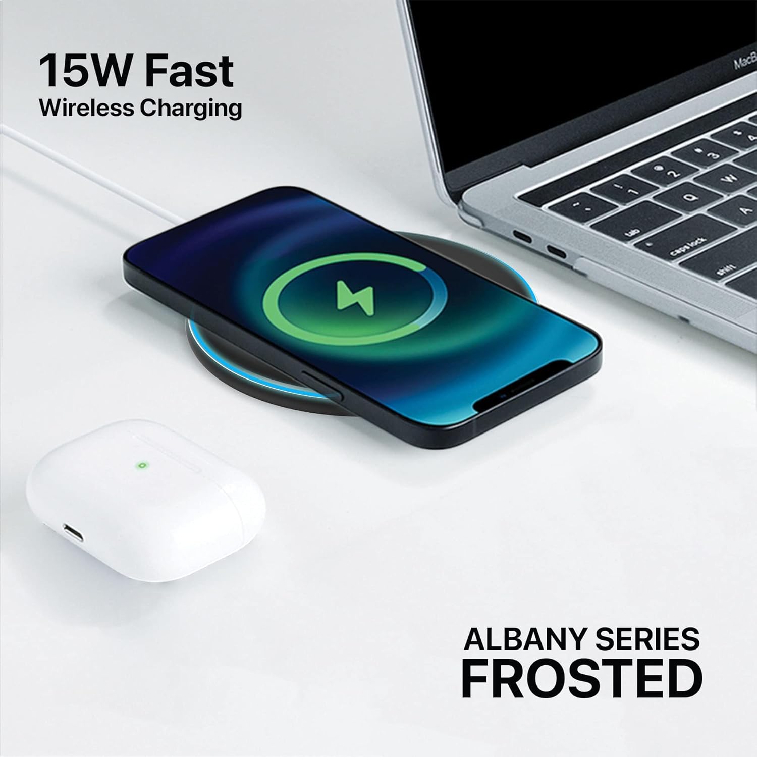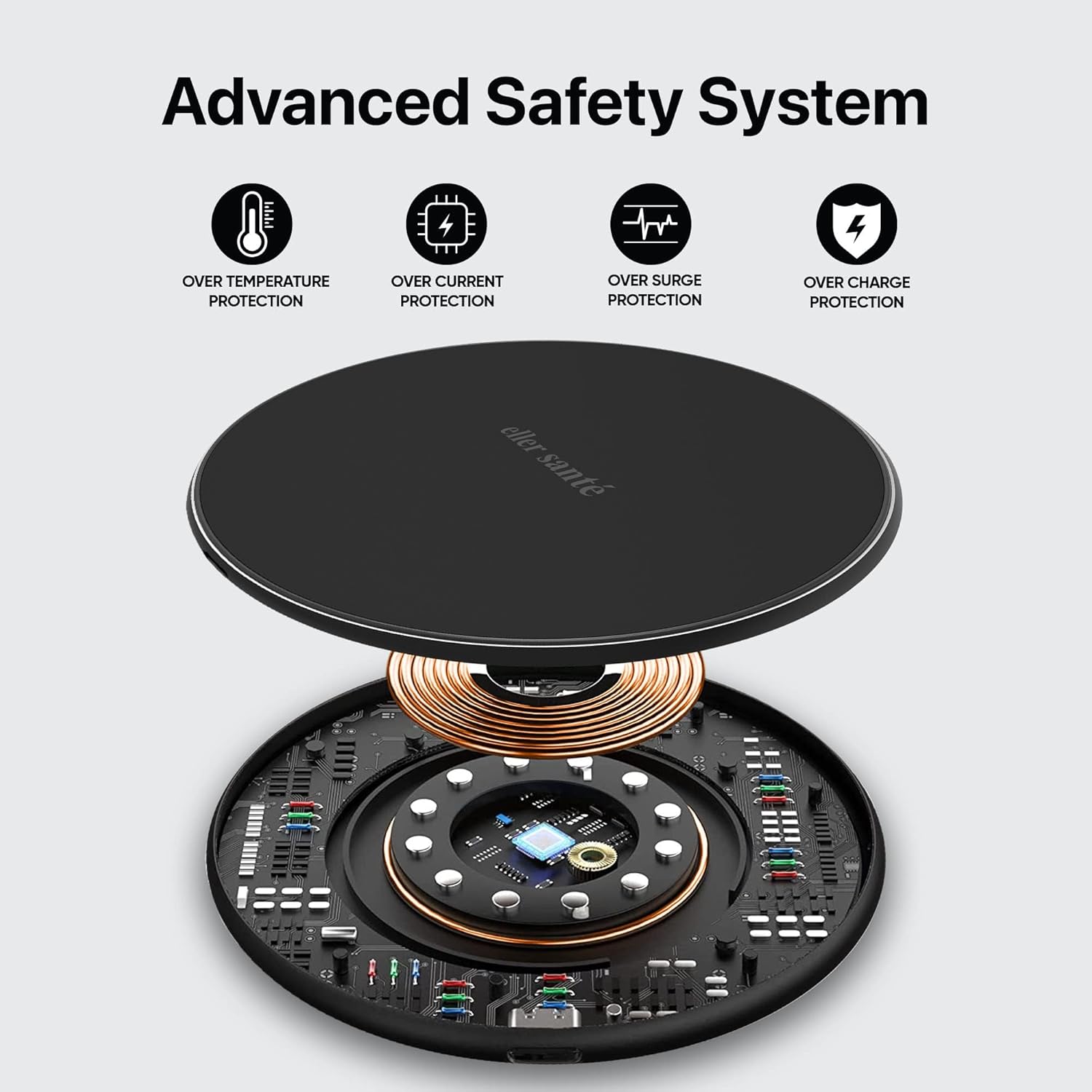 eller santé 15W Wireless Charger ALBANY SERIES Fast charging pad| PD & Qi-Certified with Type-C Cable Fireproof ABS for iPhone.