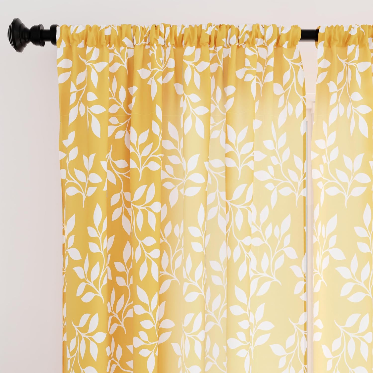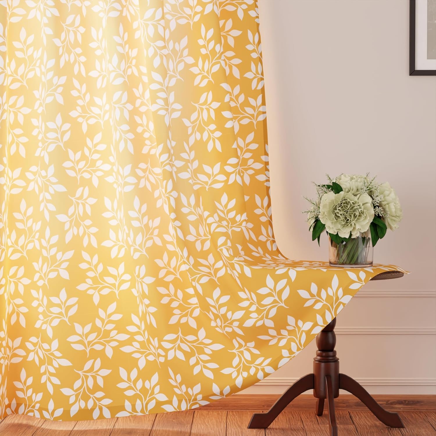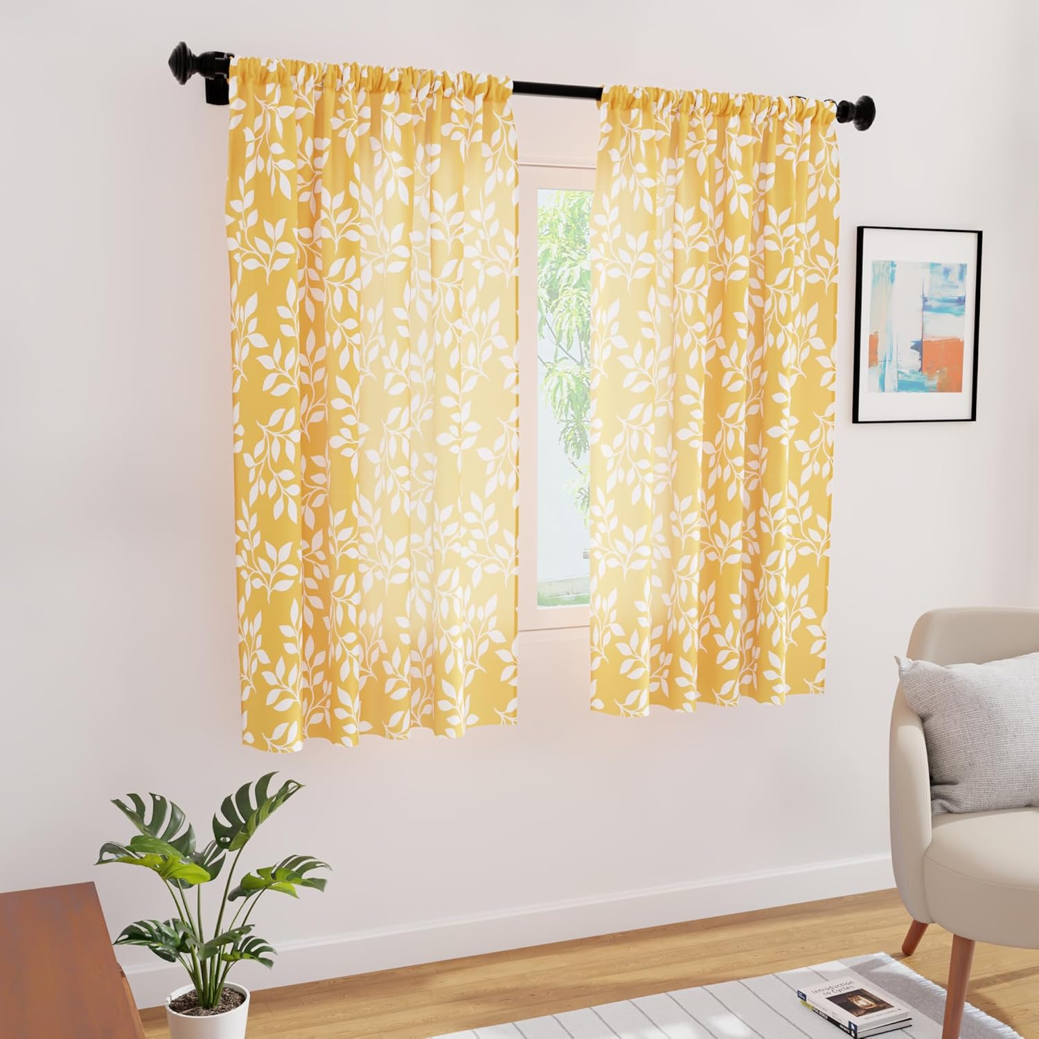 Encasa XO Window Curtains 5 ft Set of 2, Semi-Sheer Polyester Printed Door Curtain with Rod Pocket, Light-Filtering, Windows Parda for Living Room, Bedroom, Reverse Leaf Yellow 140×152 cm