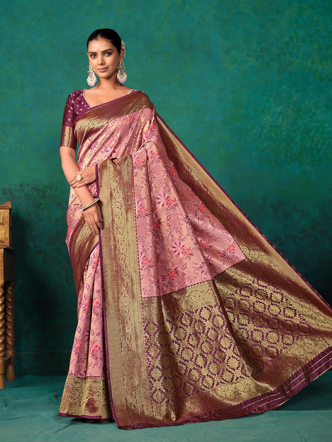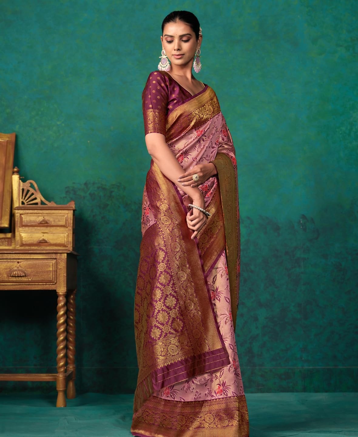 EthnicJunction Women’s Silk Blend floral Woven Saree comes with adorable colour perfect match for the party and event occasion. The Saare comes along with the un-stitched blouse piece . The fitting of the saare is perfect for an average women and it leave an great impression on other . The Fabric of the saare is silk-blended and the length and the colour of the saare is dusty pink and wine. I would definetely recommeded everyone to go for this saare.