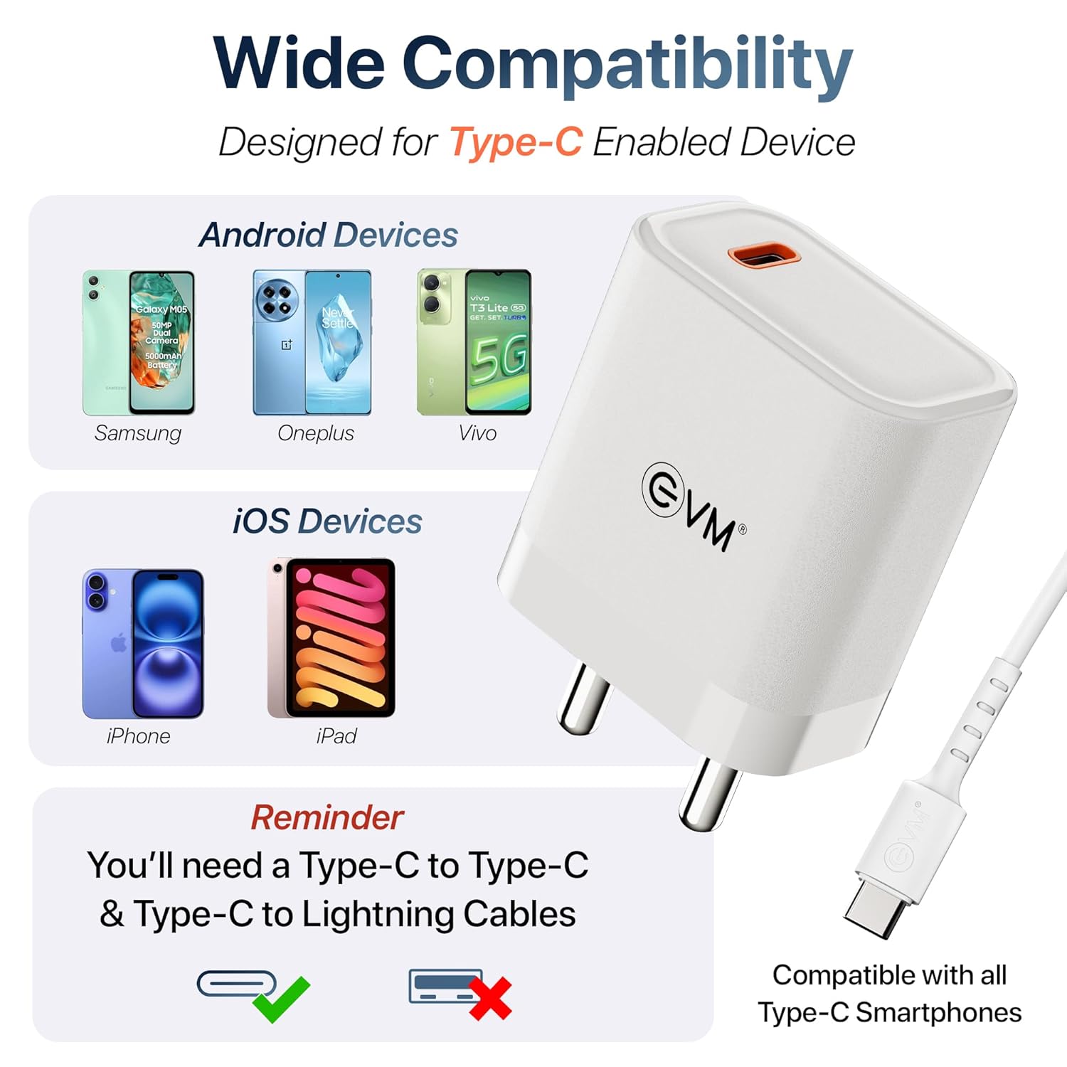 Wide Compatibility for Multiple Devices :-The EVM 25W Type-C Fast Charger supports a wide range of devices including Android smartphones, iPhones (with USB-C to Lightning cable), tablets, earbuds, and power banks, offering true universal compatibility.