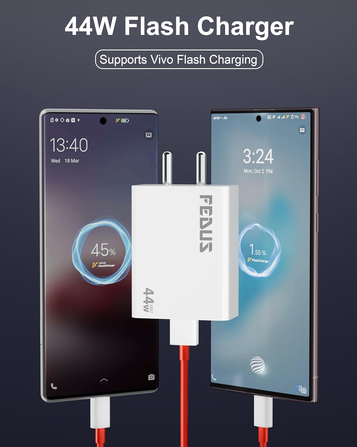 🌟🌟🌟🌟🌟 Highly Recommended!I recently bought the FEDUS Vivo 44W C-Type Flash Fast Charger, and I’m extremely satisfied with the performance. It charges my Vivo phone super fast without overheating, and the build quality feels premium. The Type-C cable is sturdy and reliable, making it a perfect replacement or extra charger. Definitely worth the price — highly recommended for Vivo users looking for fast and safe charging!