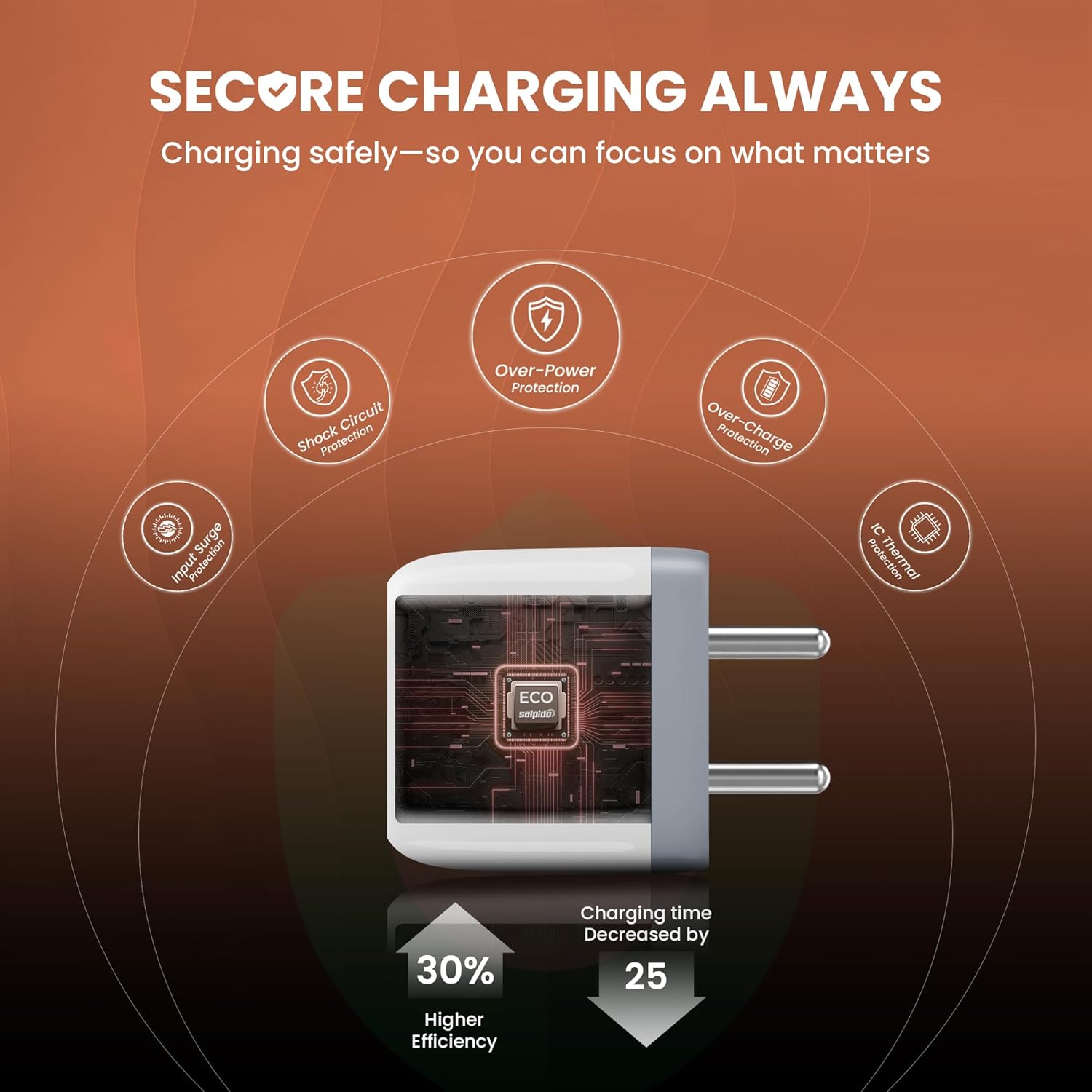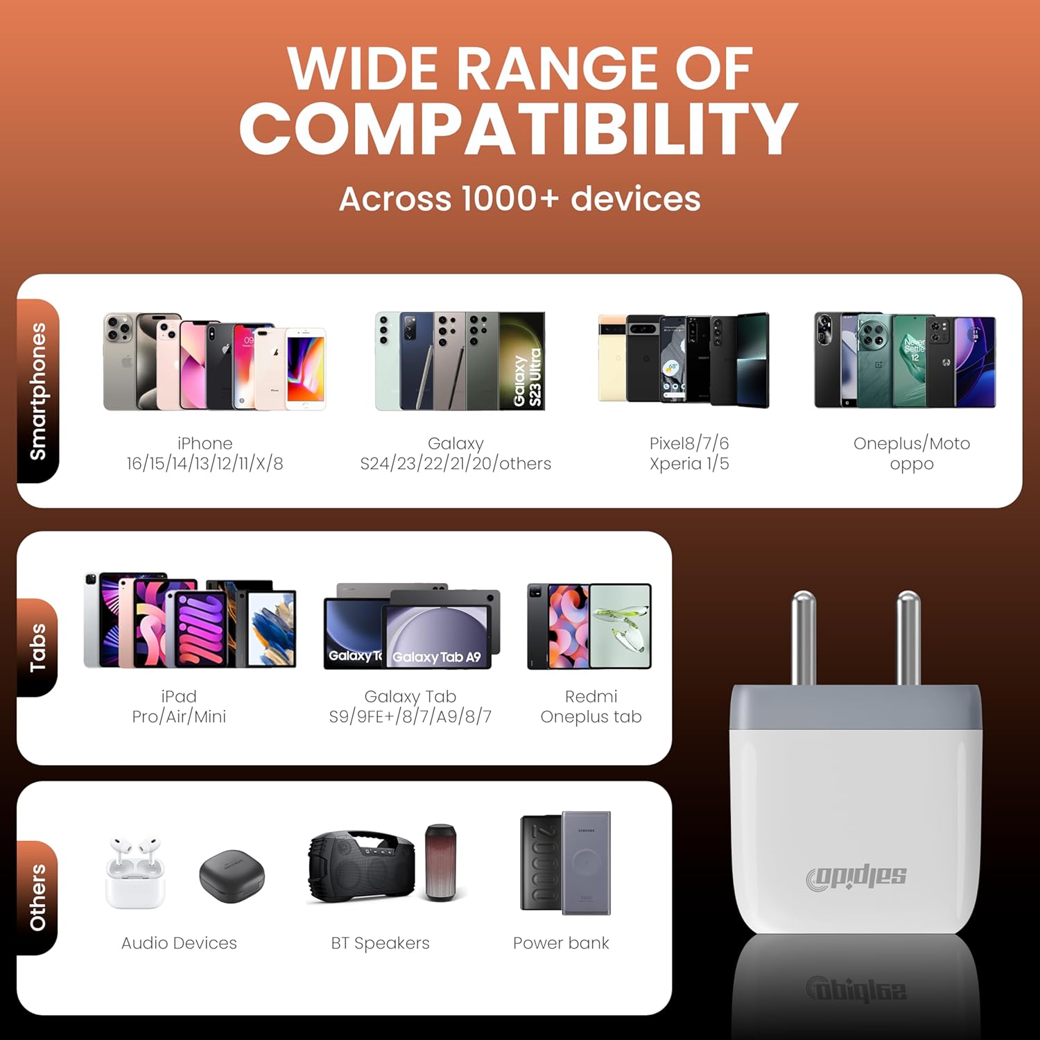 Smart Chip Safety Protection: The mobile charger adapter is equipped with an intelligent smart chip to safeguard against overcharging, overheating, and voltage fluctuations, ensuring safe power delivery.