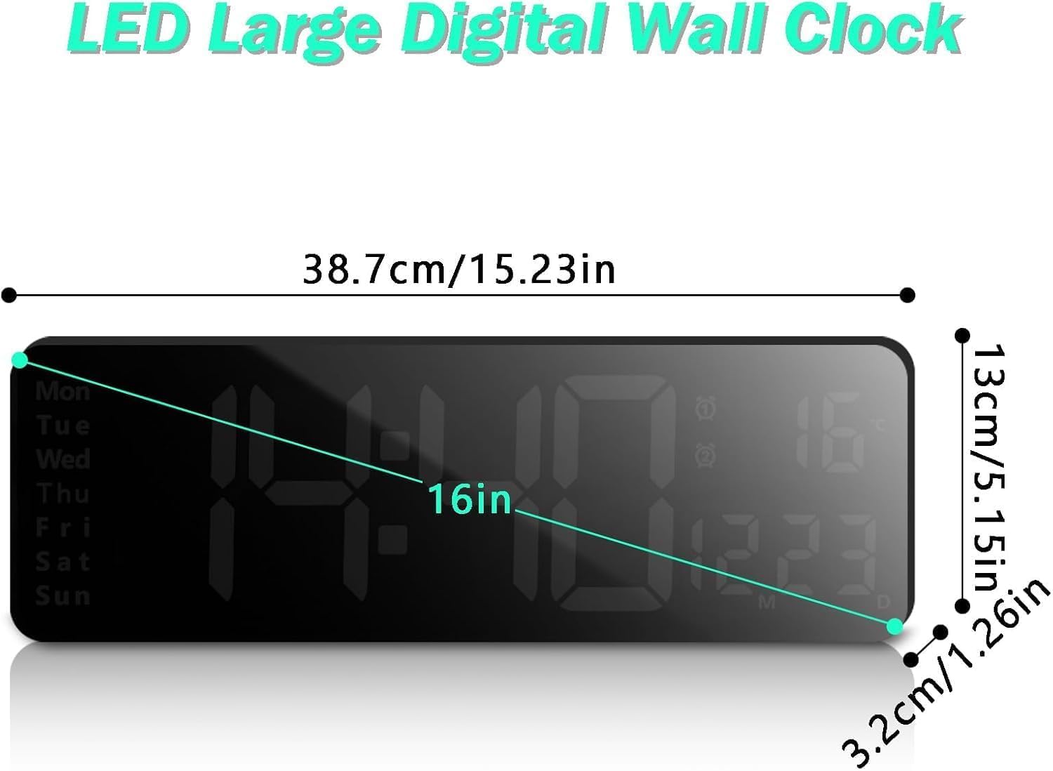 15.7” Large LED Display: This LED alarm clock has a 15.7-inch large screen display, 4 -inch high contrast clear jumbo digits make it much easier to view and read even from a great distance and from all angles. Time, date, week, temperature are displayed on the same screen
