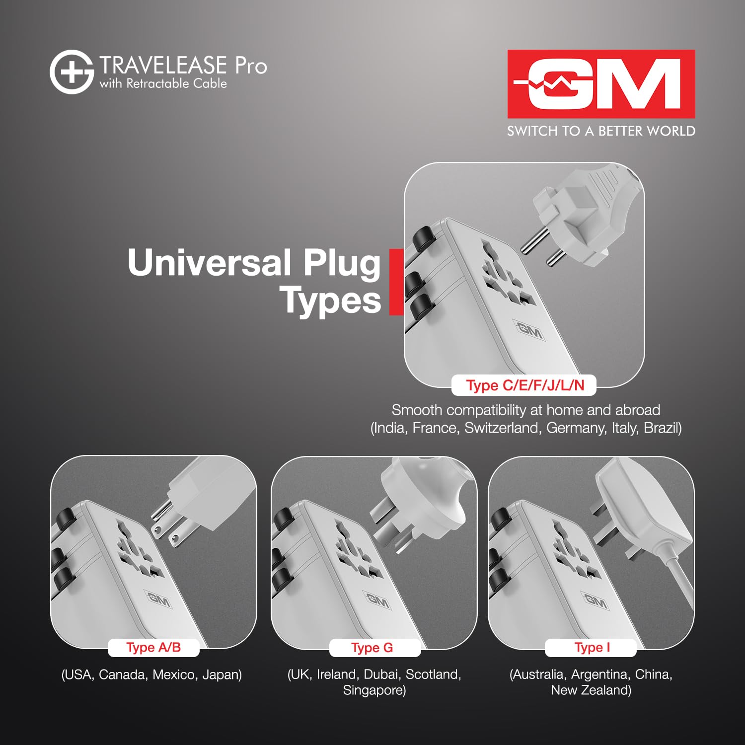 GM G+ 70W Travelease Pro International Universal Travel Adapter with 75mm Retractable Cable | Multi Plug Adapter with Type A & C USB Port | GaN Fast Charging for Iphone 16 Pro,15,14,13 & Laptop -White