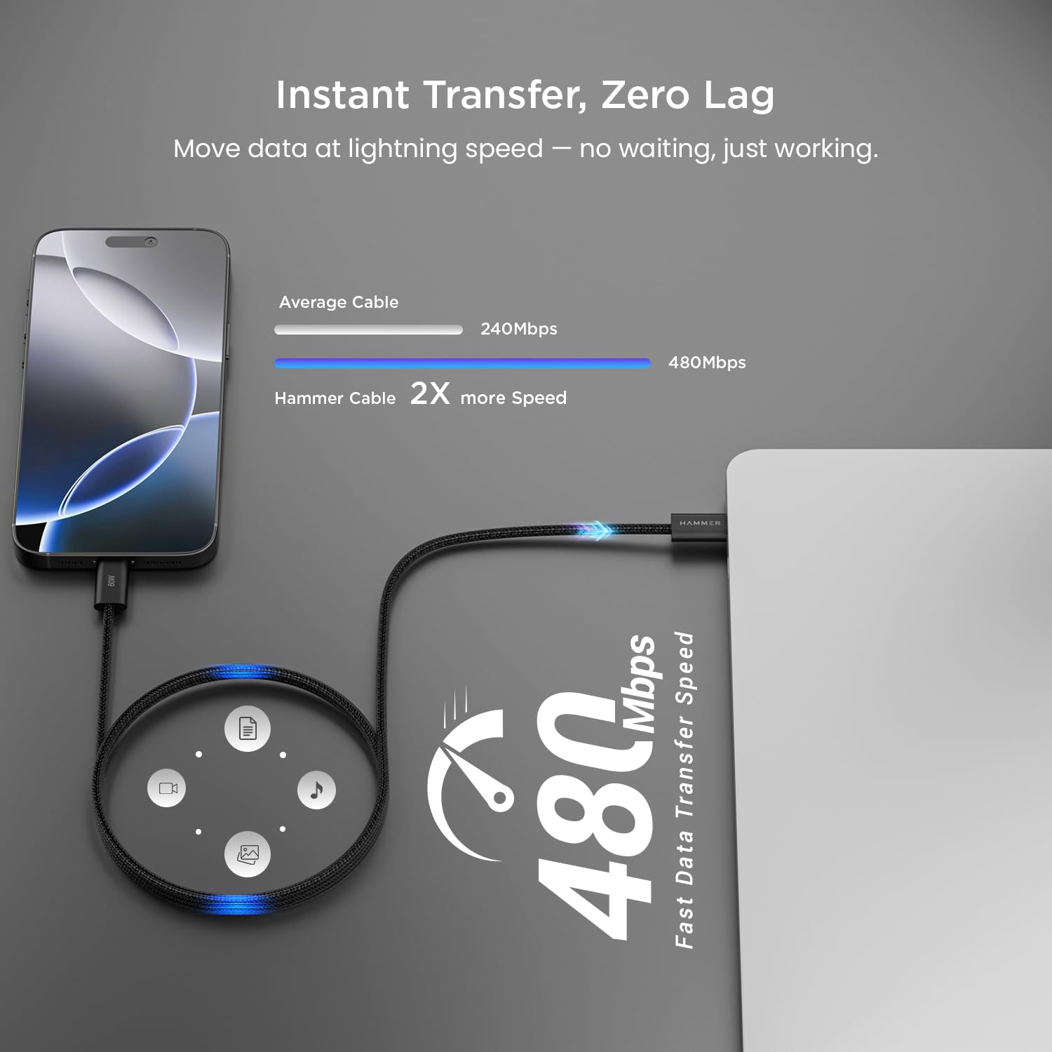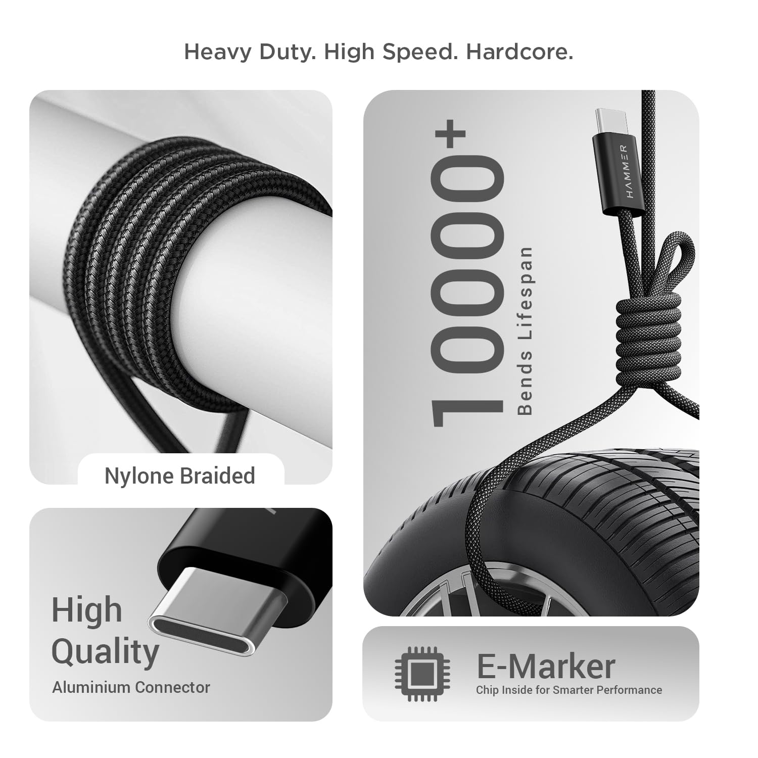The HAMMER Type C to Type C Cable (65W, Braided, Blue) is strong, tangle-free, and stylish. It charges my laptop and phone quickly with 65W PD fast charging and also supports smooth data transfer. The 1.5m length is very convenient for daily use. Overall, a durable and reliable cable worth buying.