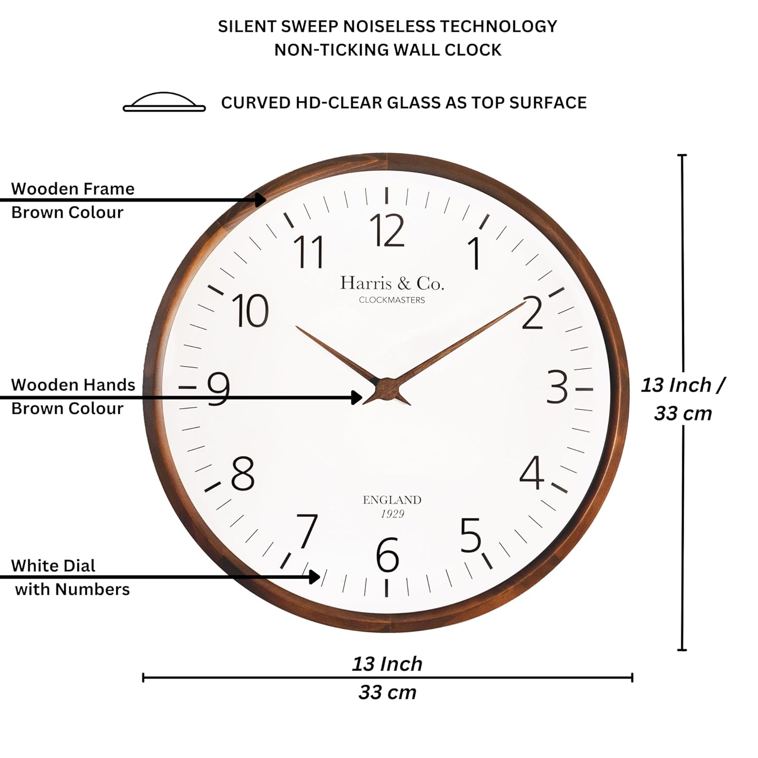 The wood frame is nice; love the curved glass face. Easy to read from a distance. Keeps time perfectly. Silent for those of us annoyed by ticking clocks. Happy, very happy that I bought it.