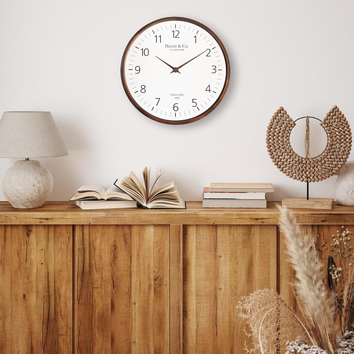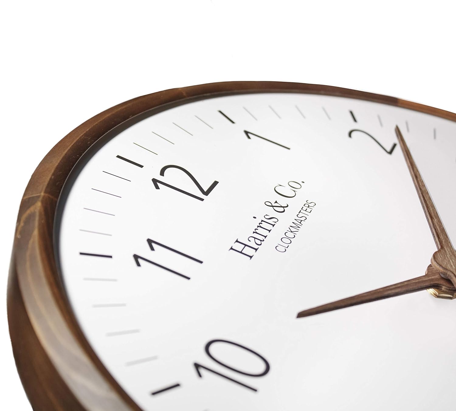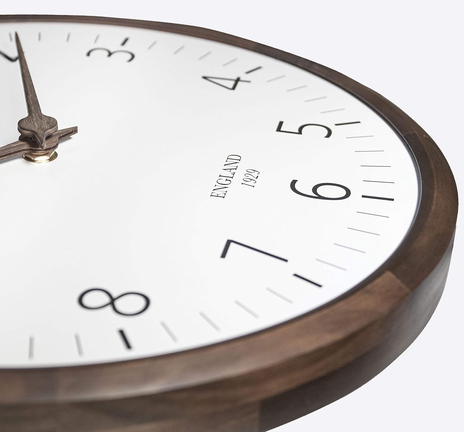 When this clock arrived I was excited by its appearance. The wood is a beautiful color and the the font of the letters is perfect for our home- easy for everyone to read and not too vintage looking. So classic. The downside- it smelled strongly of formaldehyde or something similar when it arrived. I let it offgas for a couple of weeks in the basement and it eventually went away. If I wasn’t so pleased with its appearance I would def. have sent it back because of the smell. It has kept time well. 3.7 stars would be my rating.