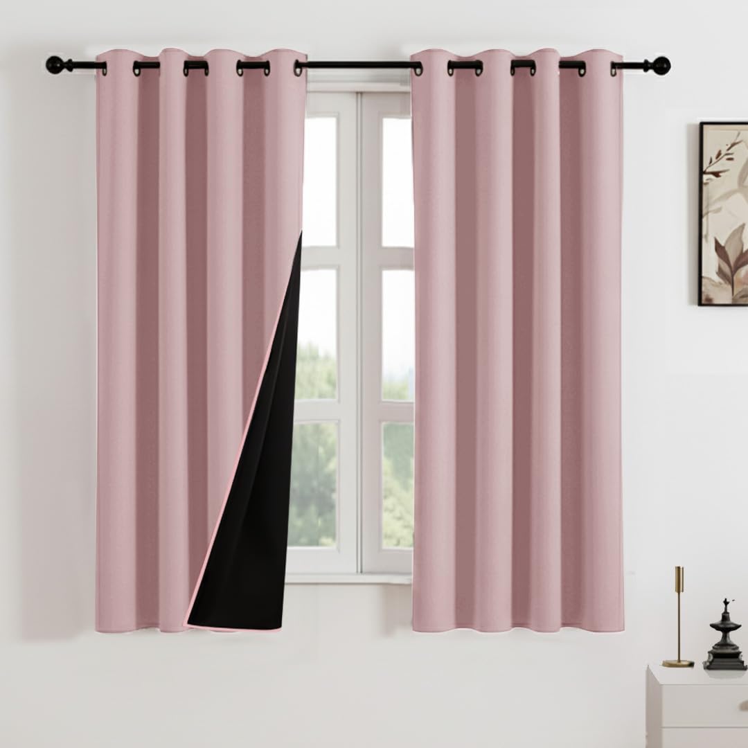 HOMEMONDE 100% True Blackout Curtains 5 Feet Long – Heavy Faux Silk Room Darkening Curtains with Black Backing, Room Privacy and Thermal Insulation Panels Pack of 2 – (60 Inch, Solid Pink)