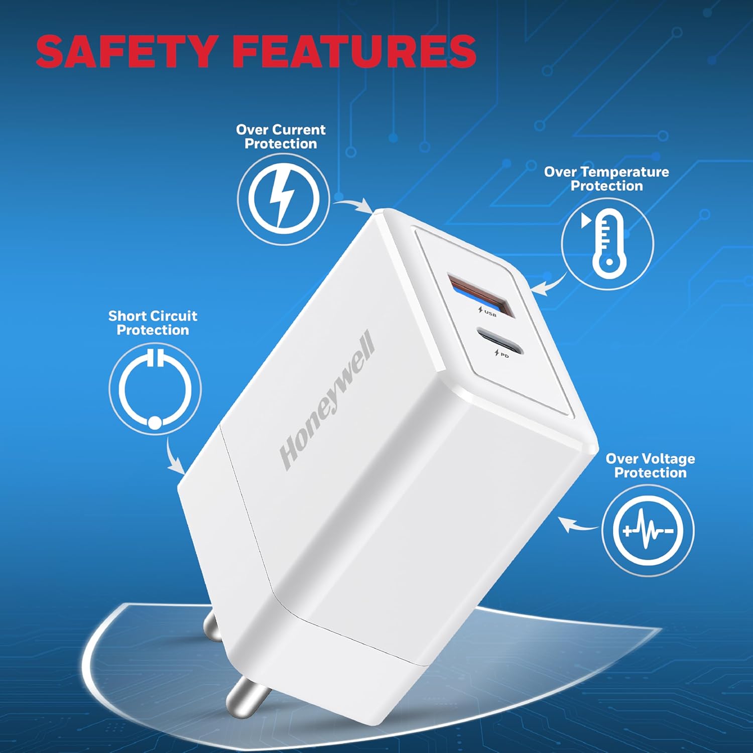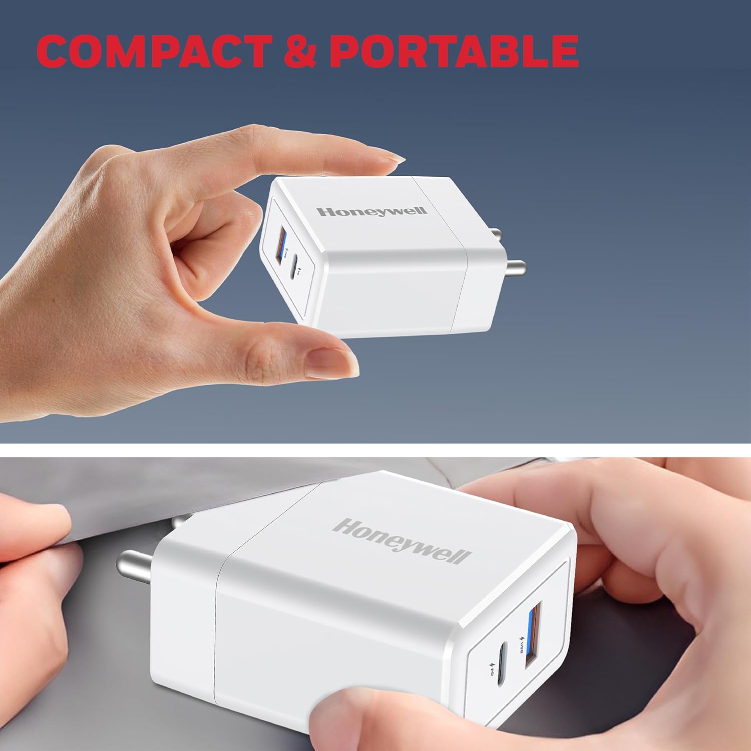 Honeywell Zest Charger GaN 65W, Ultra-Fast Charger with PPS Support, 1xType C PD 3.0 Port & 1x USB A Port, BIS Certified, Compatible with iPhone,MacBook Air,iPad Pro,Pixel,Galaxy,Laptops