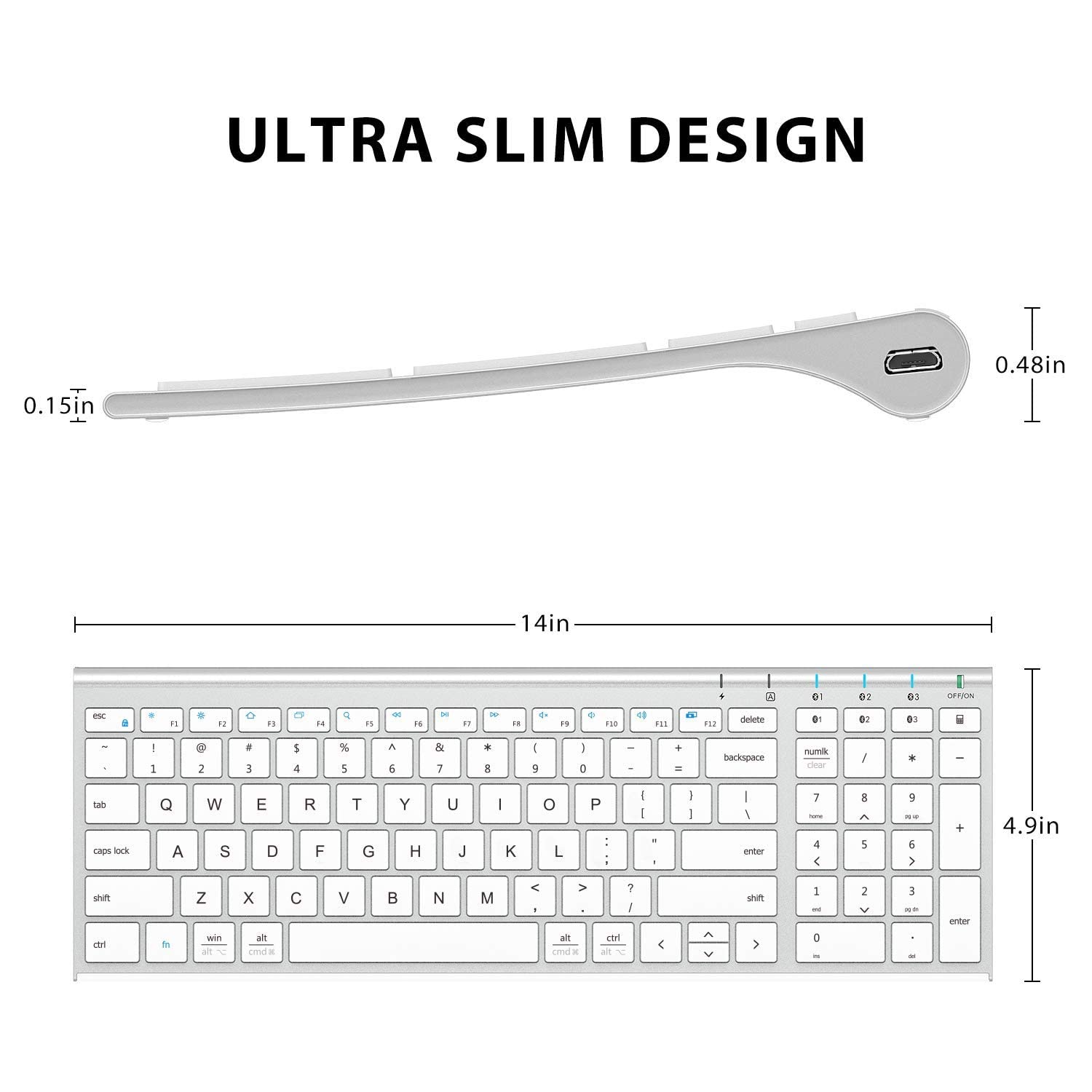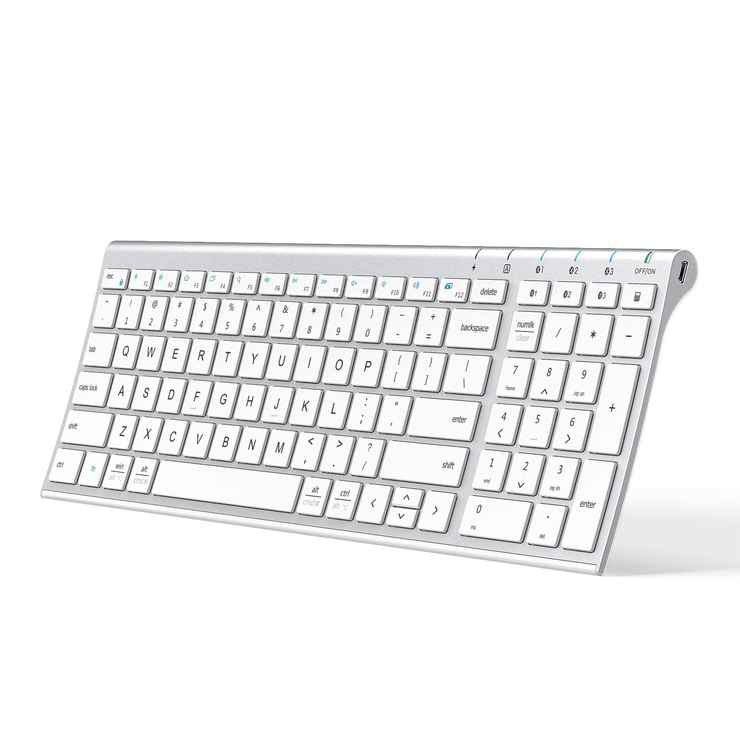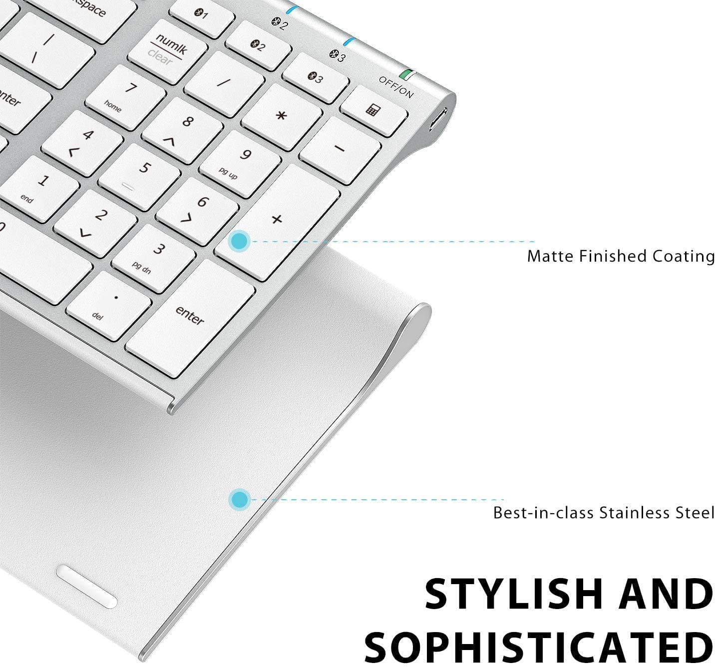 I love this keyboard (and this sort of keyboard in general) because of various reasons.Firstly, ergonomics and design. I work and play from my computer at home, and while I’ve had larger, bulkier keyboards, I feel like these smaller and lighter ones are far better to alleviate the effects of the repeated movement on my fingers and wrist. It is also quiet, easy to move, and small, so it barely takes up any space in my desk. It does not sacrifice the numeric keypad on the right, which is important to me.Secondly, battery life. I have an easy-to-access cable on my desk, but I don’t have to recharge it often. The fact that it goes into sleep mode means I don’t have to be turning it off nightly.Thirdly, easy to clean. Other keyboards can often get dust and lint underneath the keys; with this sort of keyboard, a simple dusting now and then suffices.This one has an additional feature which seems very handy, though I won’t be using it often, which is the ability to connect to a different device with the touch of a button. Overall, highly recommended and worth the price.