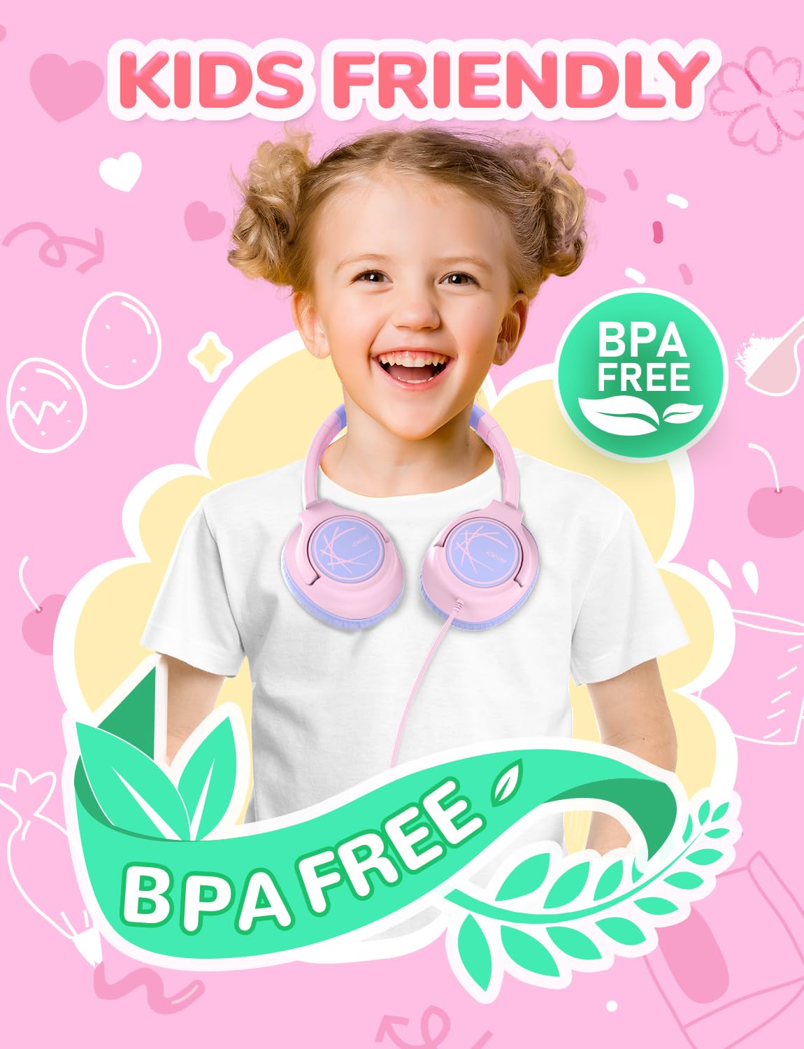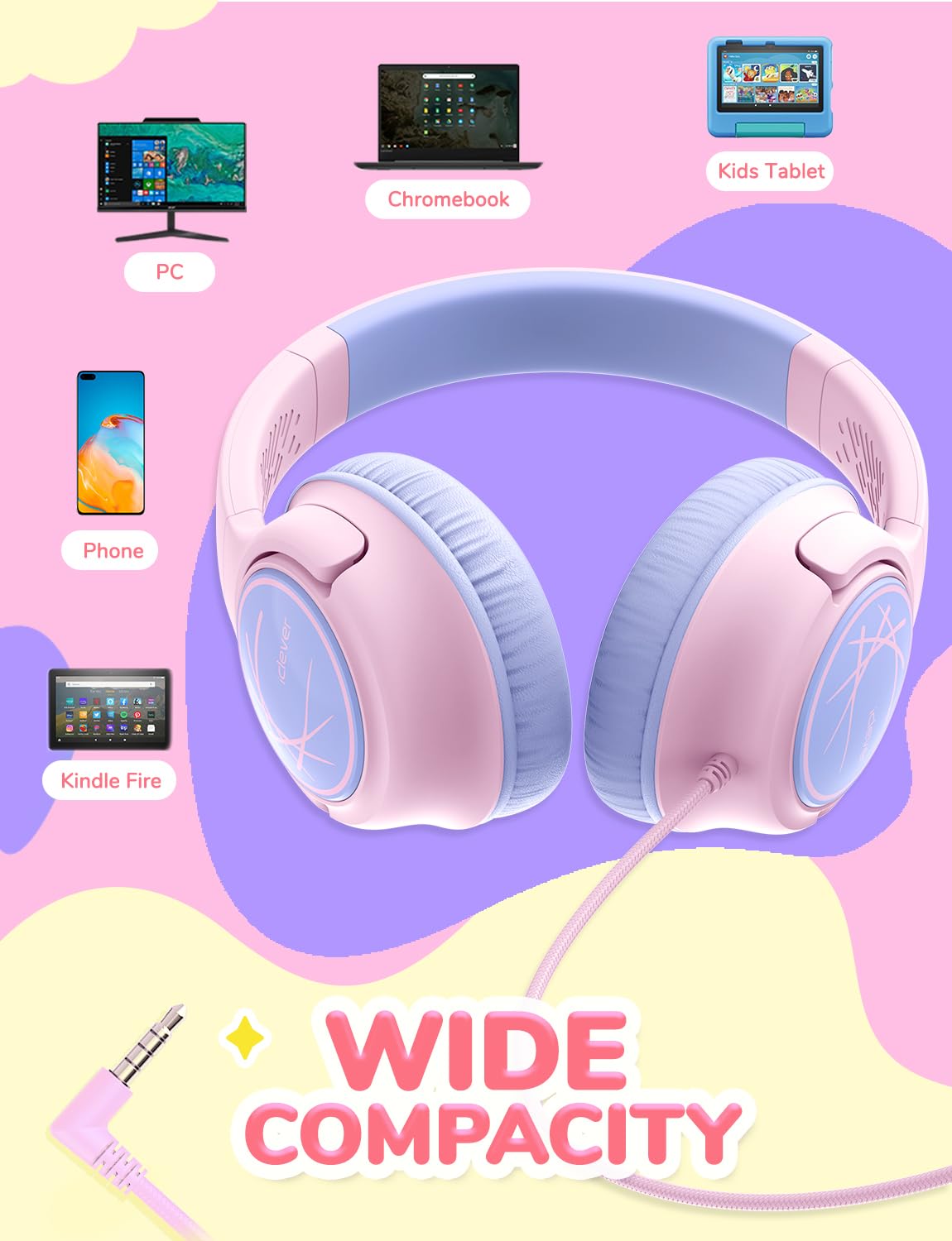 iClever HS26 Kids Headphones Cord, 85dBA Safe Volume Wired Headphones, Stereo Sound Foldable Adjustable, 3.5mm Jack, Over Ear Kids Headphone for School/Boys/Girls/iPad (Blue&Pink)