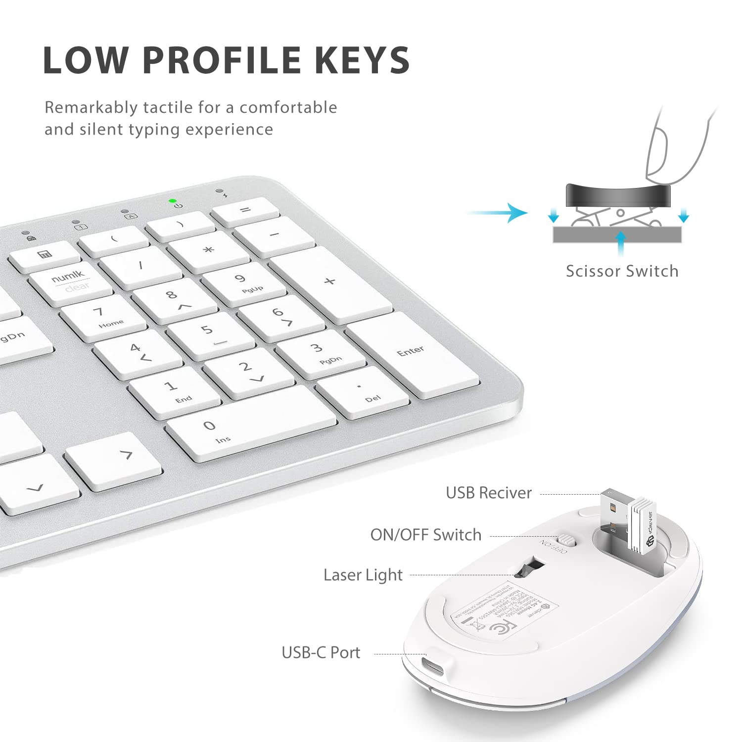 This keyboard is slim and Sleek perfect for a minimalist desk area. It’s very lightweight but doesn’t feel cheap. It’s super easy to use the keys are bright and all function properly zero lag and the charge lasts forever.