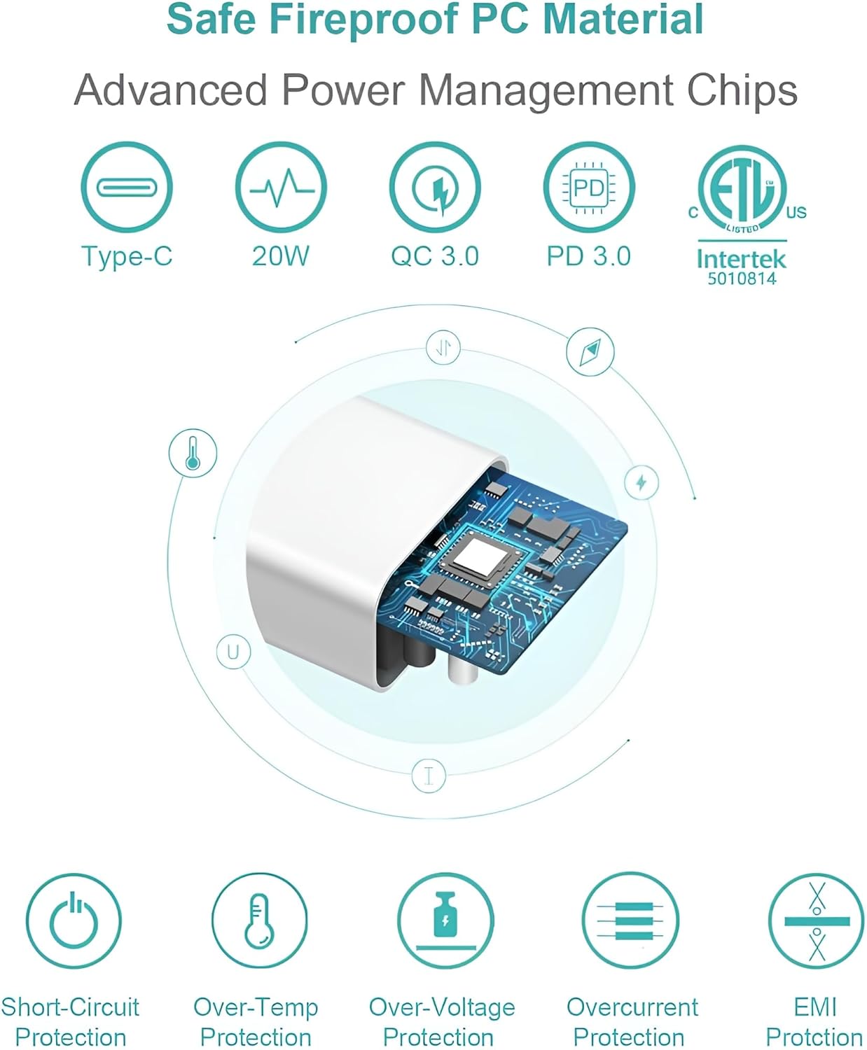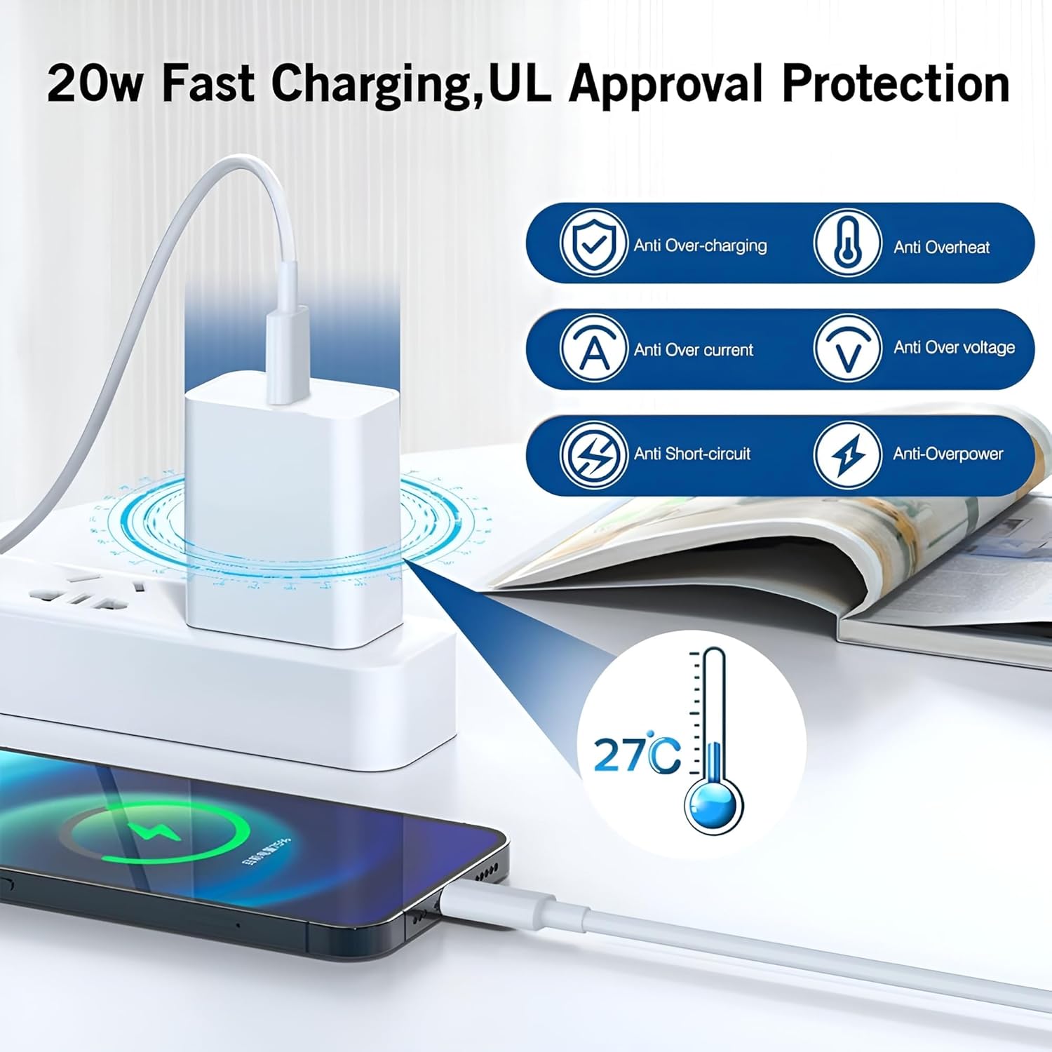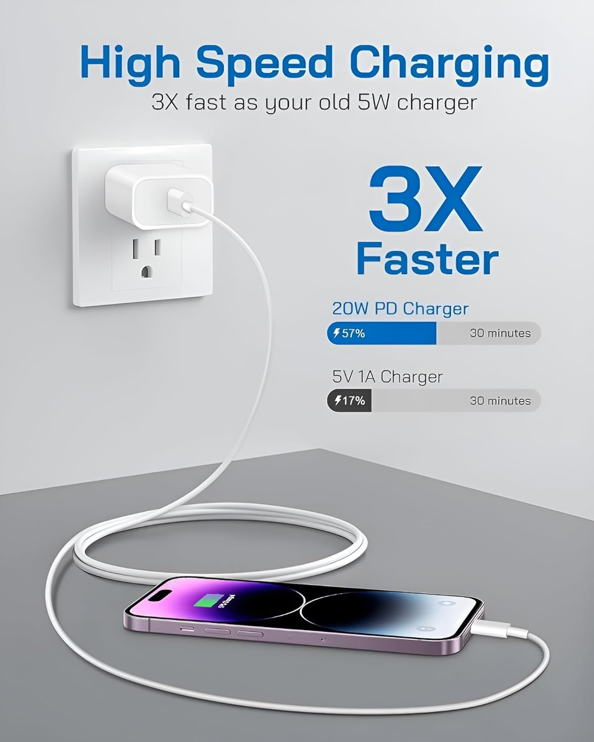 ✅⚡️20W PD Fast Charger: 20W USB-C power adapter for fast, efficient charging. Charge your device from 0% to 60% in just 30 minutes, over 3 times faster than a traditional 5V/1A adapter.