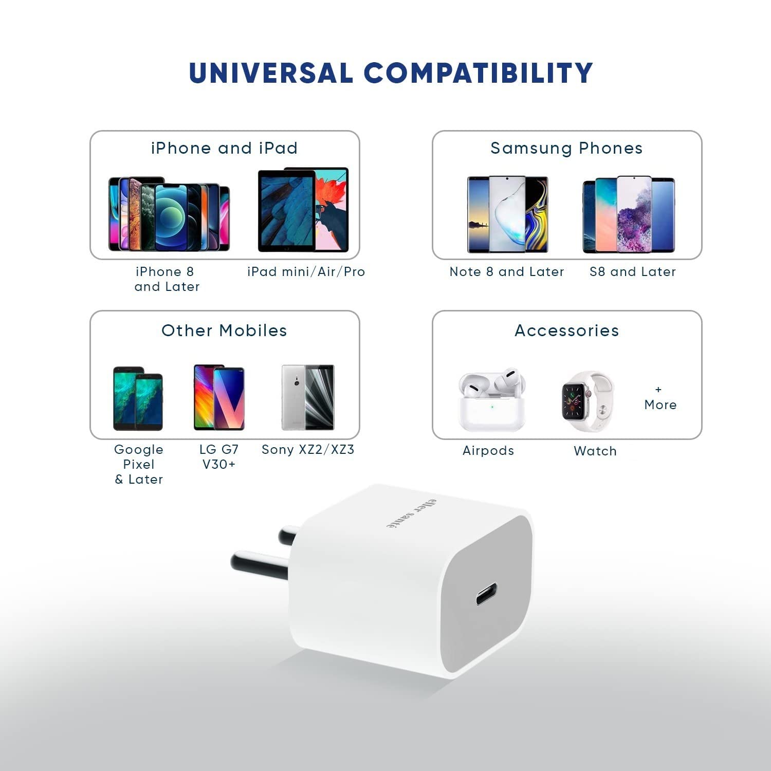 QC Output DC 3.6-6.5V/3A, 6.5-9V/2A, 9-12V/1.5A (18W Max) PD Output 5V/3A, 9V/3A, 12V/2.5A, 15V/2A (20W Max) Multiple Protections Overvoltage, overcurrent, short circuit, overtemperature, etc. Input AC 100-240V-50/60Hz 0.8A iPhone Compatibility Apple iPhone 15, iPhone 15 Plus, iPhone 15 Pro, iPhone 15 Pro Max, iPhone 14,iPhone 14 Plus, iPhone 14 Pro, iPhone 14 Pro Max, iPhone 13, iPhone 13 Pro, iPhone 13 Pro Max, iPhone 13 mini, iPhone 12, iPhone 12 Pro, iPhone 12 Pro Max, iPhone 12 mini, iPhone 11, iPhone 11 Pro, iPhone 11 Pro Max, iPhone XS Max, iPhone XR, iPhone X/XS, iPhone 8 Plus, iPad Pro 2nd generation, iPad Pro, iPad, iPad Mini, iPad Air Samsung Compatibility Samsung Galaxy S23, Samsung Galaxy S23 Plus, Samsung Galaxy S23 Ultra, Samsung Galaxy Z Fold4, Samsung Galaxy Z Flip 4, Samsung Galaxy Z Flip 3, Samsung Galaxy Z Fold3, Samsung Galaxy Z Flip, Samsung Galaxy Z Fold2, Samsung Galaxy S22, Samsung Galaxy S22+, Samsung Galaxy S22 Ultra, Samsung Galaxy S21, Samsung Galaxy S21+. Samsung Compatibility Samsung Galaxy S21 Ultra, Samsung Galaxy S21 FE 5G, Samsung Galaxy M53 5G, Samsung Galaxy M51, Samsung Galaxy S20, Samsung Galaxy S20 Plus, Samsung Galaxy S20 Ultra, Samsung Galaxy Note 20, Samsung Galaxy Note 10, Samsung Galaxy A14 5G, Samsung Galaxy A33 5G, Samsung Galaxy A53 5G, Samsung Galaxy F23 5G, Samsung Galaxy M33 5G and etc. Others Google Pixel 6, Google Pixel 5, Nothing Phone 1, OnePlus 10 Pro, OnePlus 10R, OnePlus 10T, OnePlus 9, OnePlus 9 Pro, OnePlus 8, OnePlus 8 Pro, iQOO Z6 5G, iQOO Z6 Lite 5G and Other Type C Devices. Also Compatible with AirPods (2nd Generation), AirPods (3rd Generation), AirPods Pro (2nd Generation), AirPods Pro, Apple watch and others.