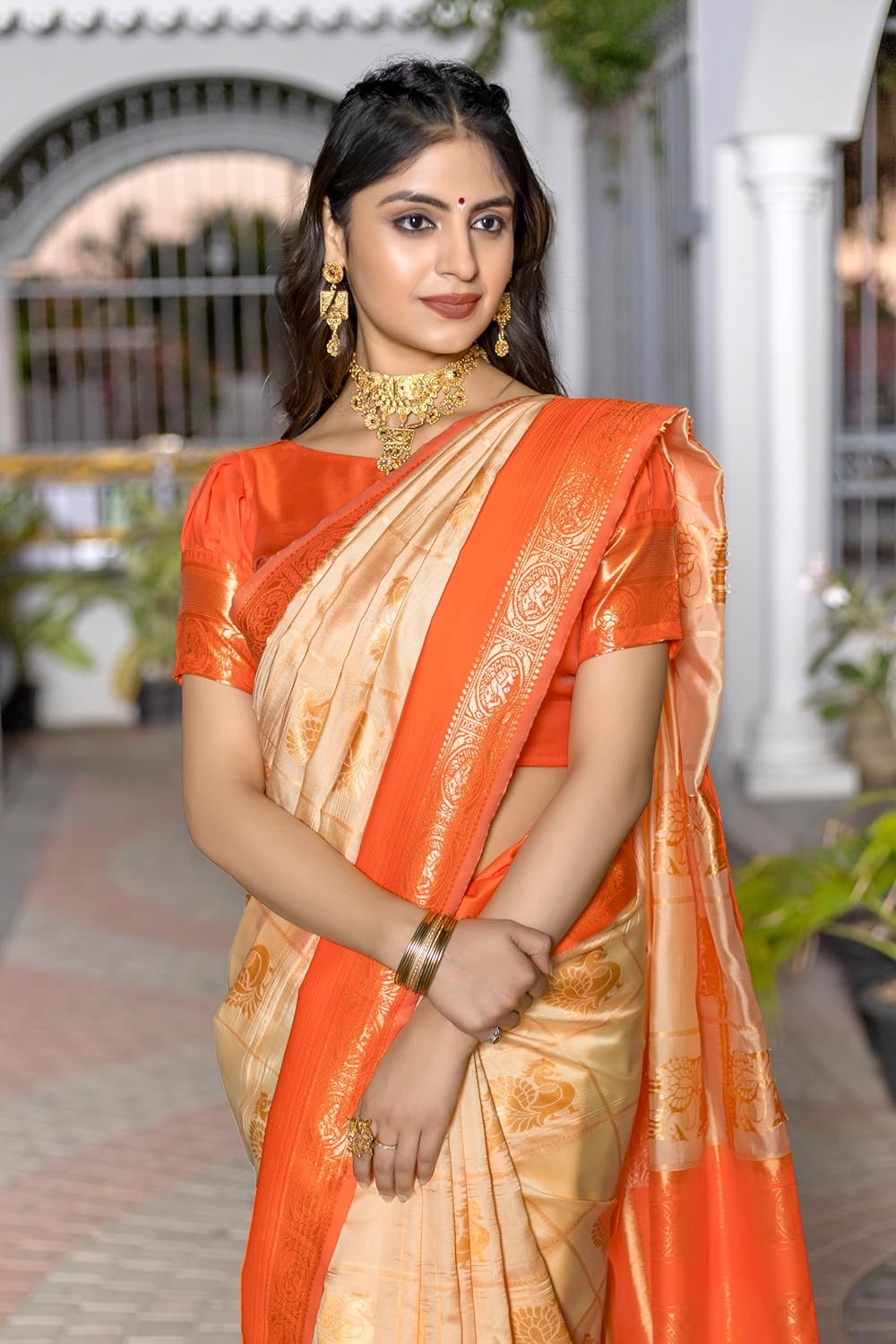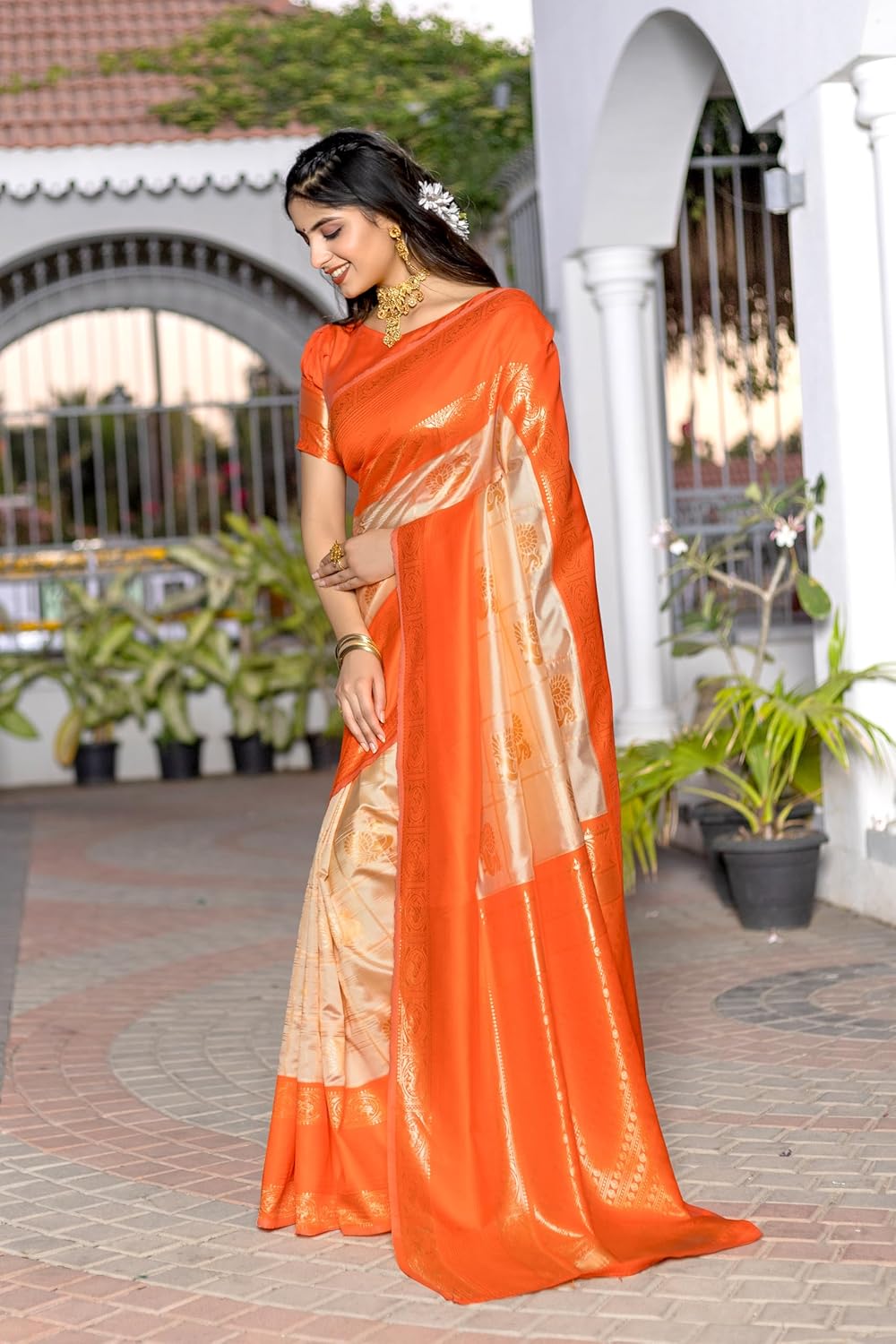 The quality of the saree is not good. Very cheap fabric used. Not at all a Kanjivaram saree, just kept in the description for the sake of sales. The photo displayed here includes a red fabric in the border of the saree but the saree which is delivered doesn’t have such red fabric border which clearly states that it’s not a Kanjivaram saree (Again used for Sales). Also a weird chemical smell comes from the saree most probably a dye. Not at all recommended.Note – The quality of the saree delivered, you can probably get it for ₹200 – ₹300 in offline market.