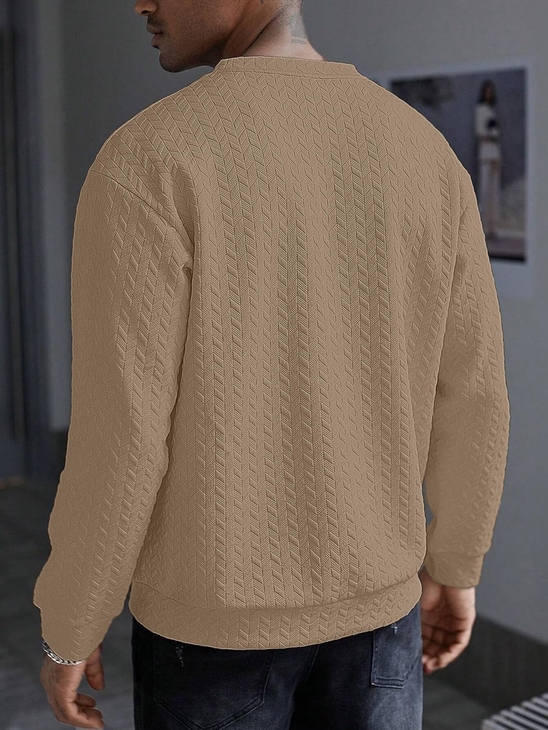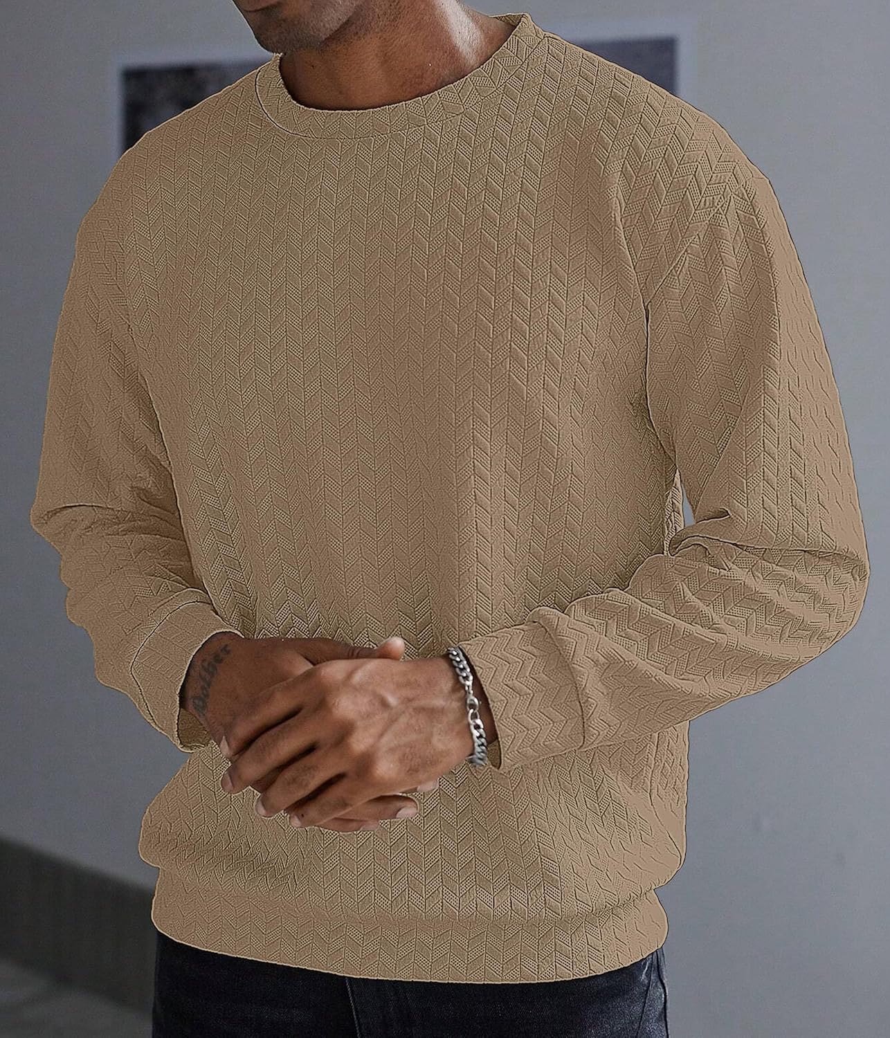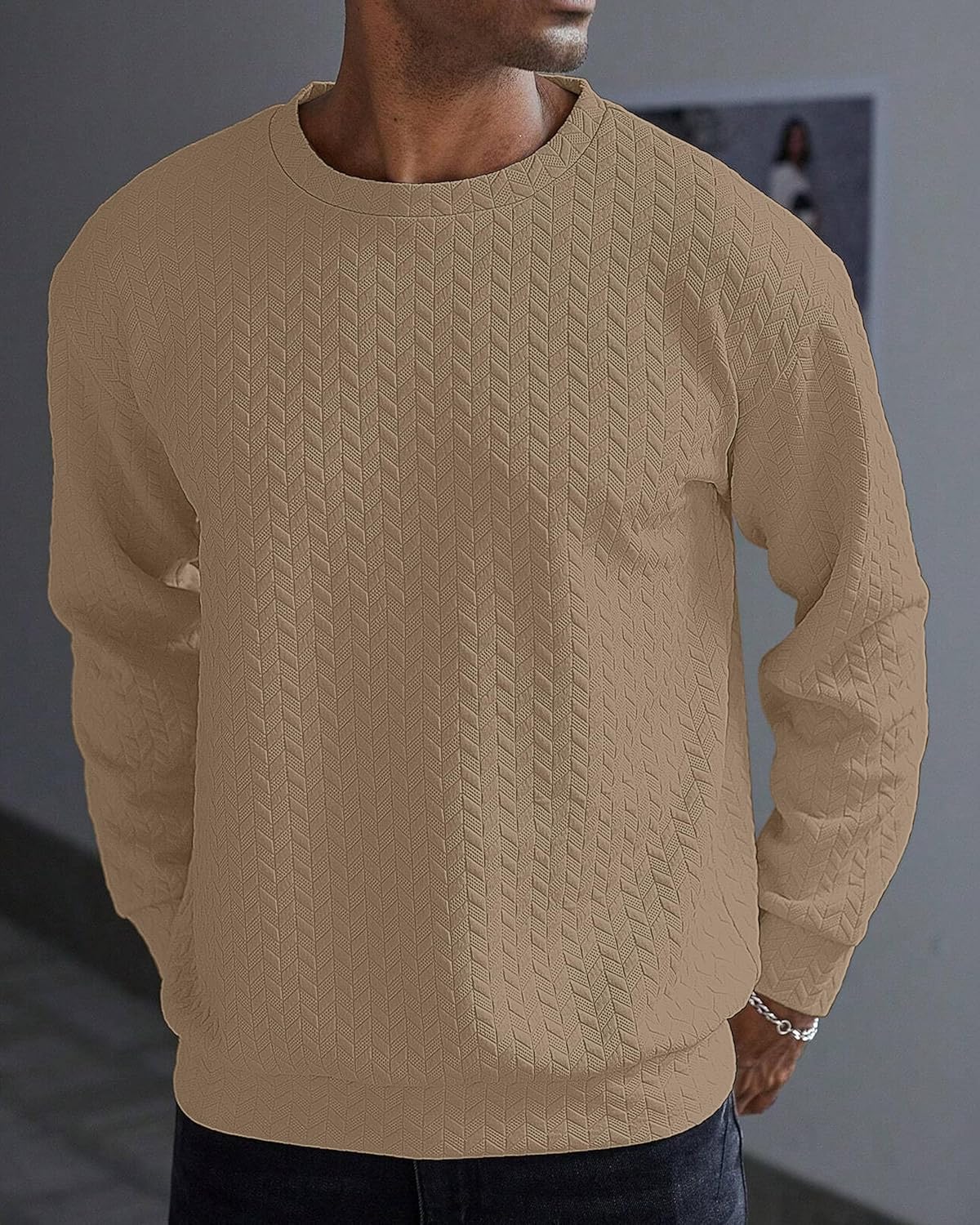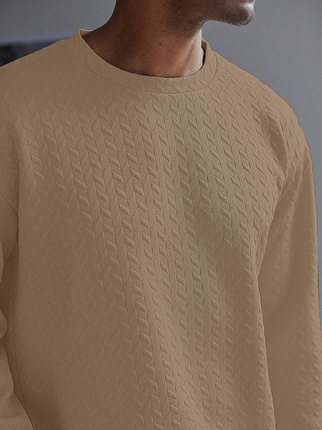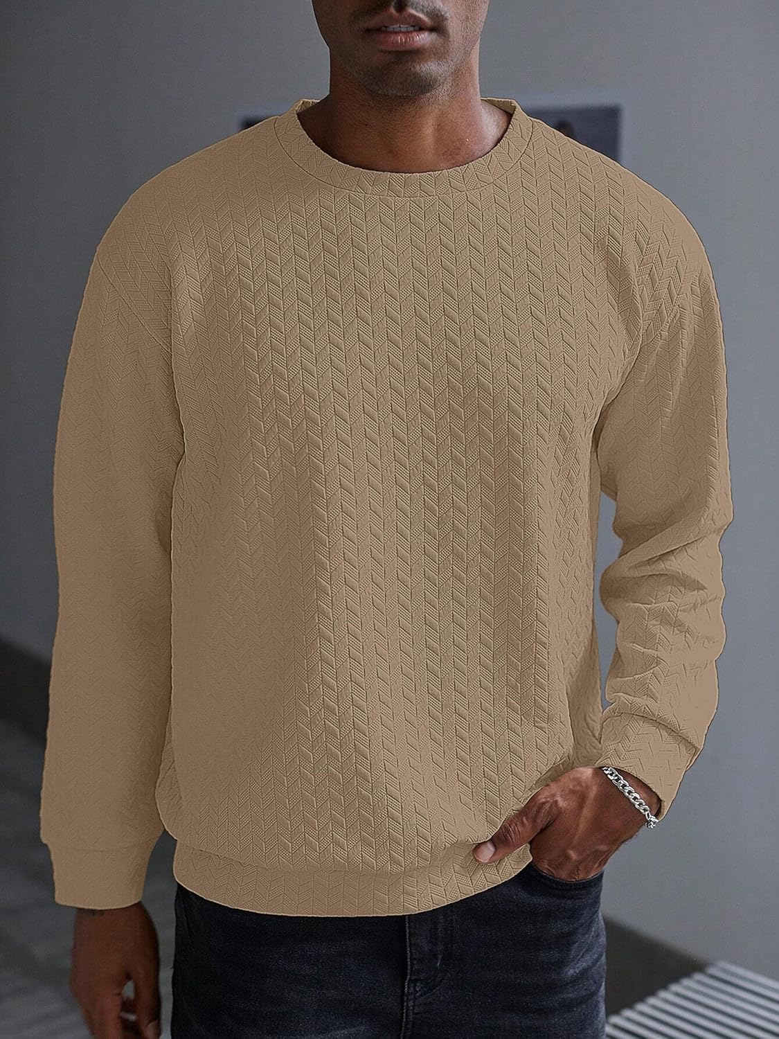 Elevate your casual wardrobe with this sophisticated full-sleeve sweatshirt featuring an exquisite geometric textured pattern throughout. The classic crew neck design offers timeless appeal, while the structured stitching adds a premium touch to this comfortable piece. Available in versatile shades of beige, brown, and white, this sweatshirt seamlessly combines style with comfort. The intricate chevron-like pattern creates a subtle yet distinctive visual interest, making it perfect for both casual outings and relaxed social gatherings. The ribbed cuffs and hem ensure a snug fit while maintaining shape throughout wear. Crafted with attention to detail, this sweatshirt pairs effortlessly with jeans or trousers for a polished casual look. The medium-weight fabric provides ideal comfort for year-round wear, making it a versatile addition to any wardrobe. The relaxed fit allows for easy movement while maintaining a smart silhouette. Perfect for those who appreciate understated elegance in their everyday wear.