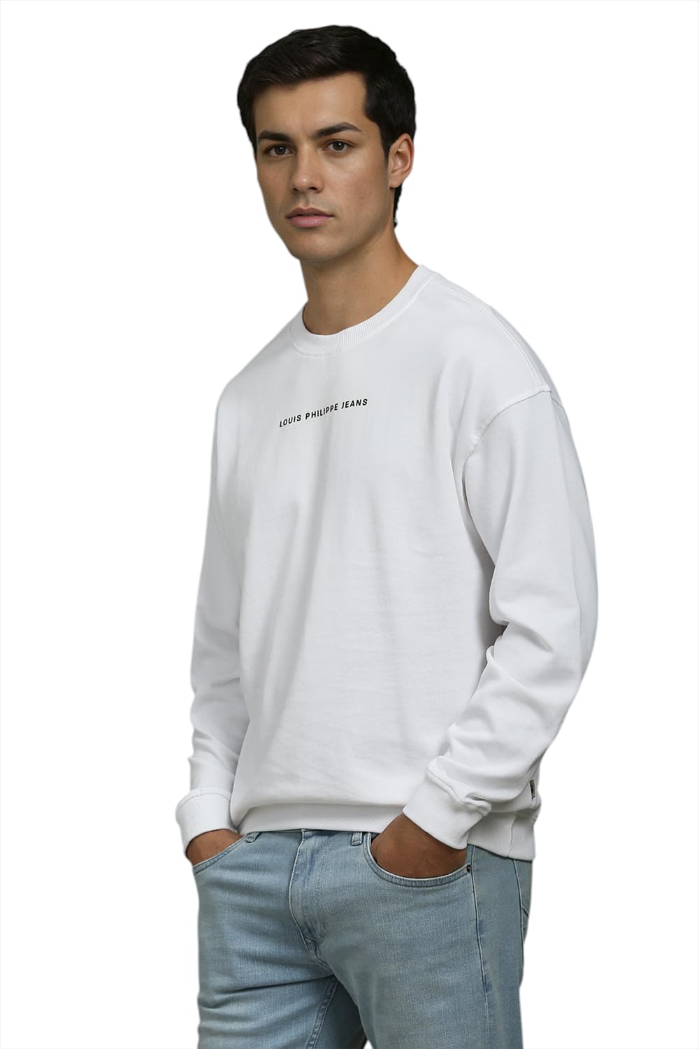 A change in temperature calls for an updated wardrobe. Beat the chills and layer up in style with this White Graphic Print sweatshirt by Louis Philippe Jeans from the House of Louis Philippe.