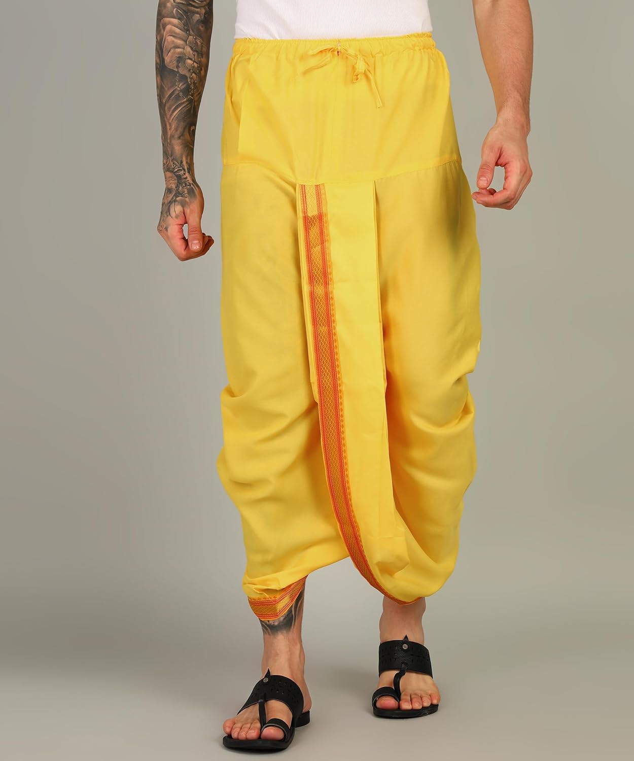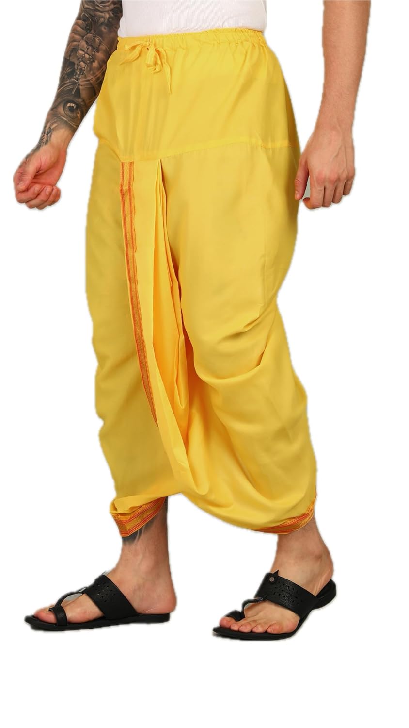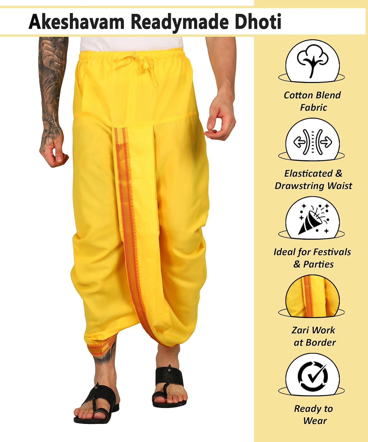 AKESHAVAM Elastic Drawsting Waist Band Dhotis are made of Art Silk and highly traditional to wear. The fine quality silk combined with rich colors along with bright Golden border makes this extremely perfect outfit to the wearer. Our Dhotis will lend you a stylish ethnic look, with ensuring comfort. Our Products are Very Trendy and easy to wear, Nowadays peoples like wear dhotis very easily. So we introduced for those guys ready to wear dhotis. most of the youngster Like this Ready to wear dhotis. Not only youngsters all peoples like this ready made dhotis.