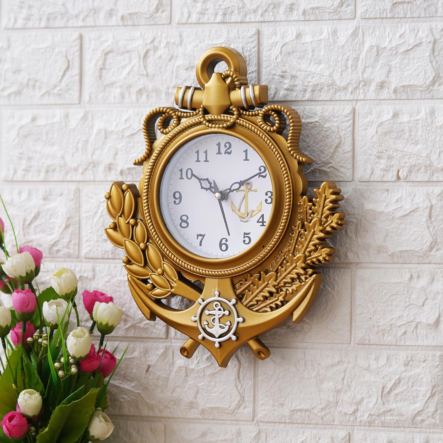 NAUTICAL DESIGN: Elegant gold-finished wall clock featuring intricate anchor motifs and ornate decorative elements for a maritime-inspired aesthetic
