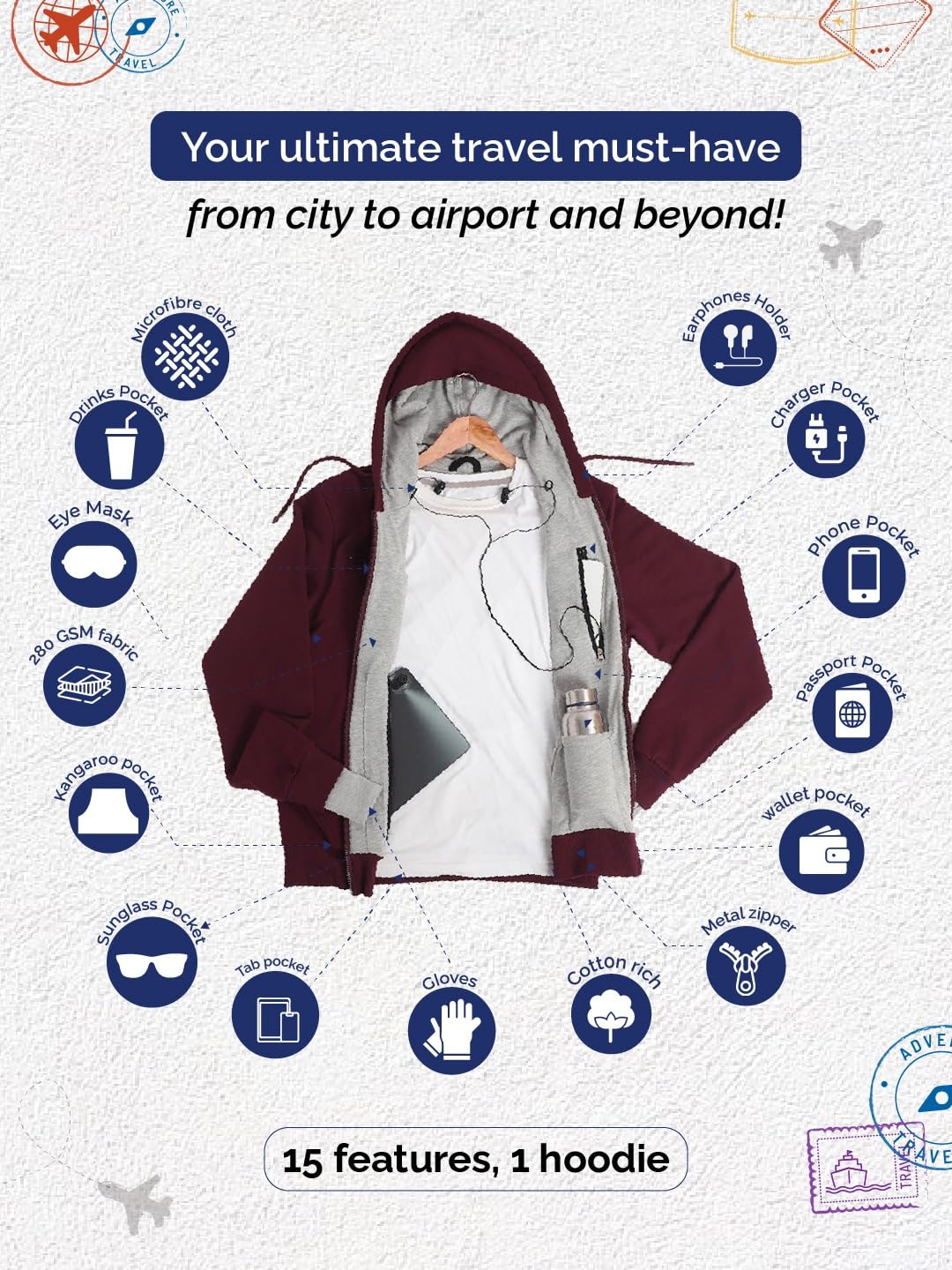 Wanderer Travel Hoodie – 15 Features in 1 Hoodie 1. Tab Pocket: Convenient pocket to securely store your tablet or similar-sized device. 2. Waterproof Phone Pocket: Dedicated pocket with waterproof lining to keep your phone safe and dry. 3. Waterproof Passport Pocket: Special waterproof pocket to protect your passport from moisture during travel. 4. In-built Gloves: Integrated gloves to keep your hands warm without the need for separate accessories. 5. Eye Mask: Attached eye mask for easy use during long trips or flights, ensuring restful sleep. 6. Drinks Pocket: Handy pocket designed to hold small drink cans or bottles for on-the-go refreshment. 7. Charger Pocket: Separate pocket to store your charger and cables neatly and within easy reach. 8. Wallet Pocket: Secure pocket to store your wallet safely while traveling. 9. Sunglass Pocket: Special pocket to keep your sunglasses safe from scratches and damage. 10. Microfiber Cloth: Comes with an attached microfiber cloth for cleaning your sunglasses or lenses on the go. 11. Kangaroo Pocket: Classic kangaroo-style front pocket for additional storage and hand-warming. 12. Earphone Holders: Convenient holders to keep your earphones tangle-free and easily accessible. 13. Made with Cotton rich fabric: The hoodie’s is made from cotton rich fabric for enhanced comfort and breathability. 14. 320 GSM Fabric: Heavyweight fleece fabric made from a durable blend of 60% cotton and 40% polyester, offering warmth and durability. 15. Premium Metal Zipper: High-quality metal zipper for smooth functionality and a premium feel.