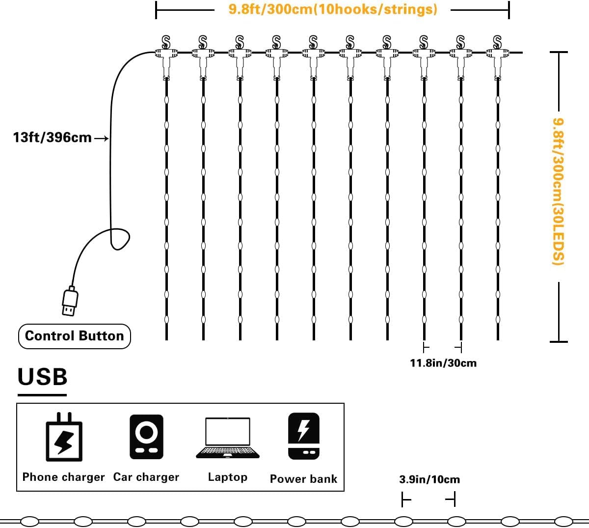 Light Color: Warm WhiteLight Source: LEDNumber Of LED: 300Size: 3 x 3 MeterControl Type: Remote ControlPackage Contents: 1 x 300 LED Curtain lights1 x Remote control (Battery included)10 x Hooks