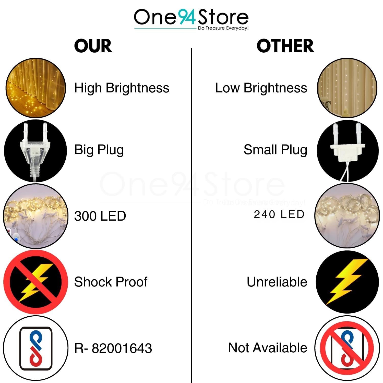 One94Store Plastic Fairy Curtain String Lights for Wall Decoration, Warm White USB Powered 300 LED’s, 8 Flashing Modes, Window Backdrop Lights for Bedroom, Party, Diwali, Christmas – 3×3 Meter