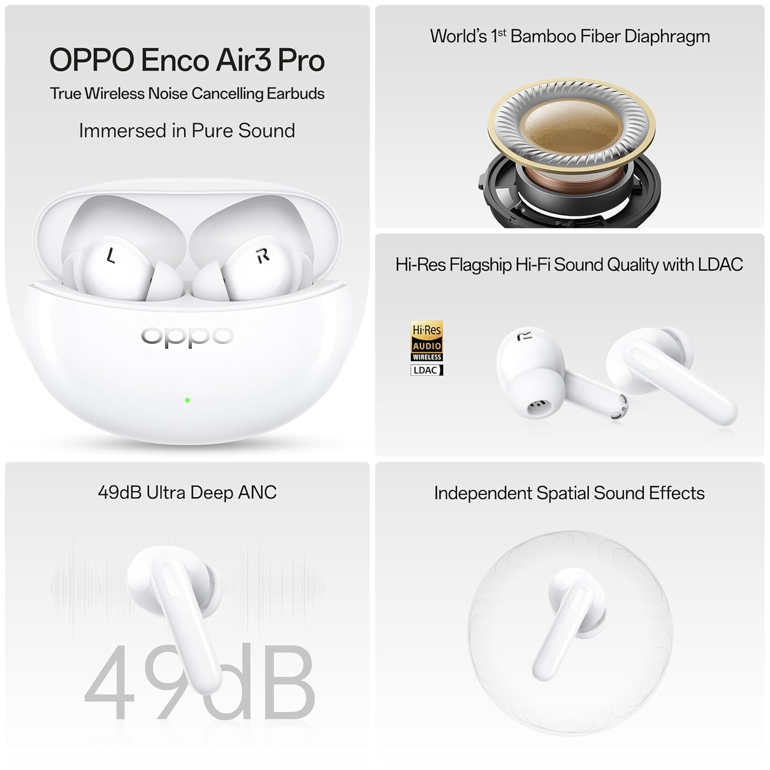 OPPO Enco Air3 Pro True Wireless in Ear Earbuds with Industry First Composite Bamboo Fiber, 49dB ANC, 30H Playtime, 47ms Ultra Low Latency,Fast Charge,BT 5.3 (White)