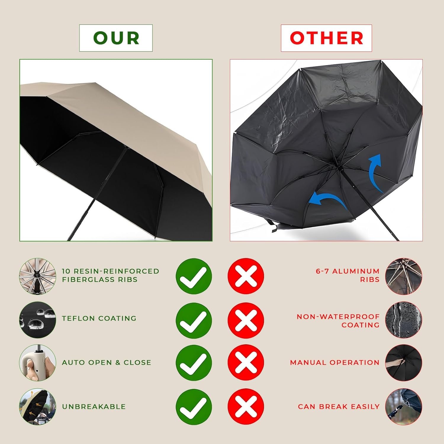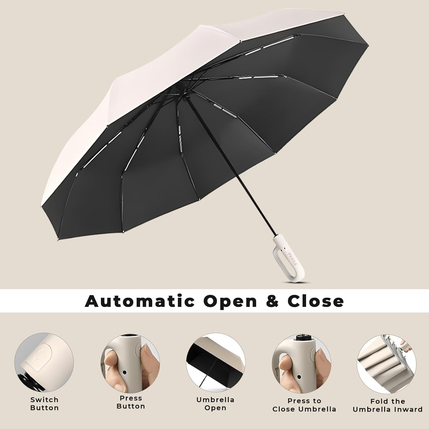 Size & Coverage: Despite being a compact folding umbrella, it offers excellent coverage (Big Size). It easily shelters two people without a struggle, which is fantastic for sudden downpours.​Built-in Toughness (10 Ribs): The 10-rib construction makes a massive difference. I tested it in some seriously strong winds, and it held its shape perfectly. The “Windproof” claim is definitely valid!​Automatic Open & Close: The automatic open and close button is smooth, responsive, and a game-changer when you’re getting in or out of a car. It operates quickly and reliably every time.