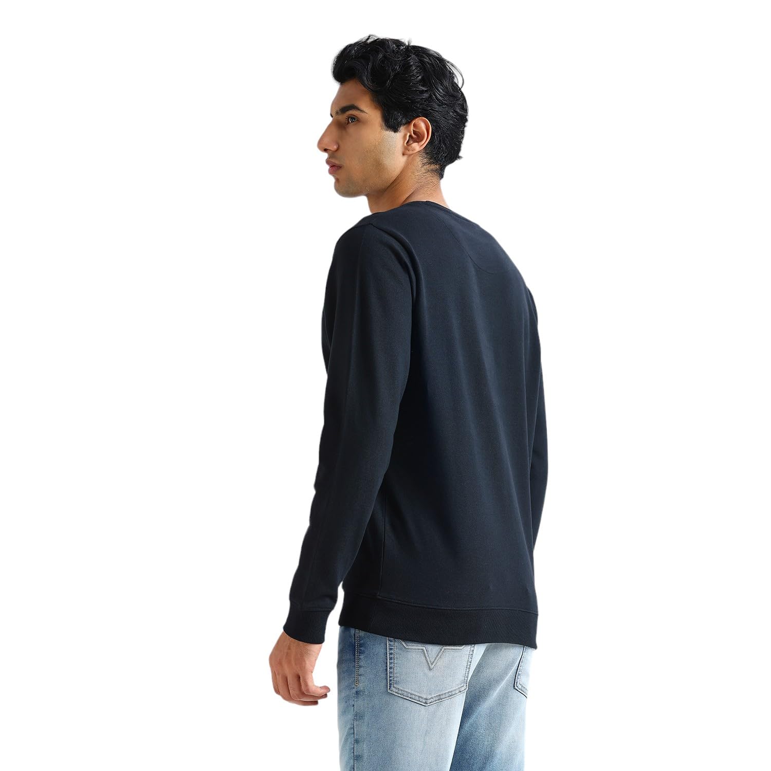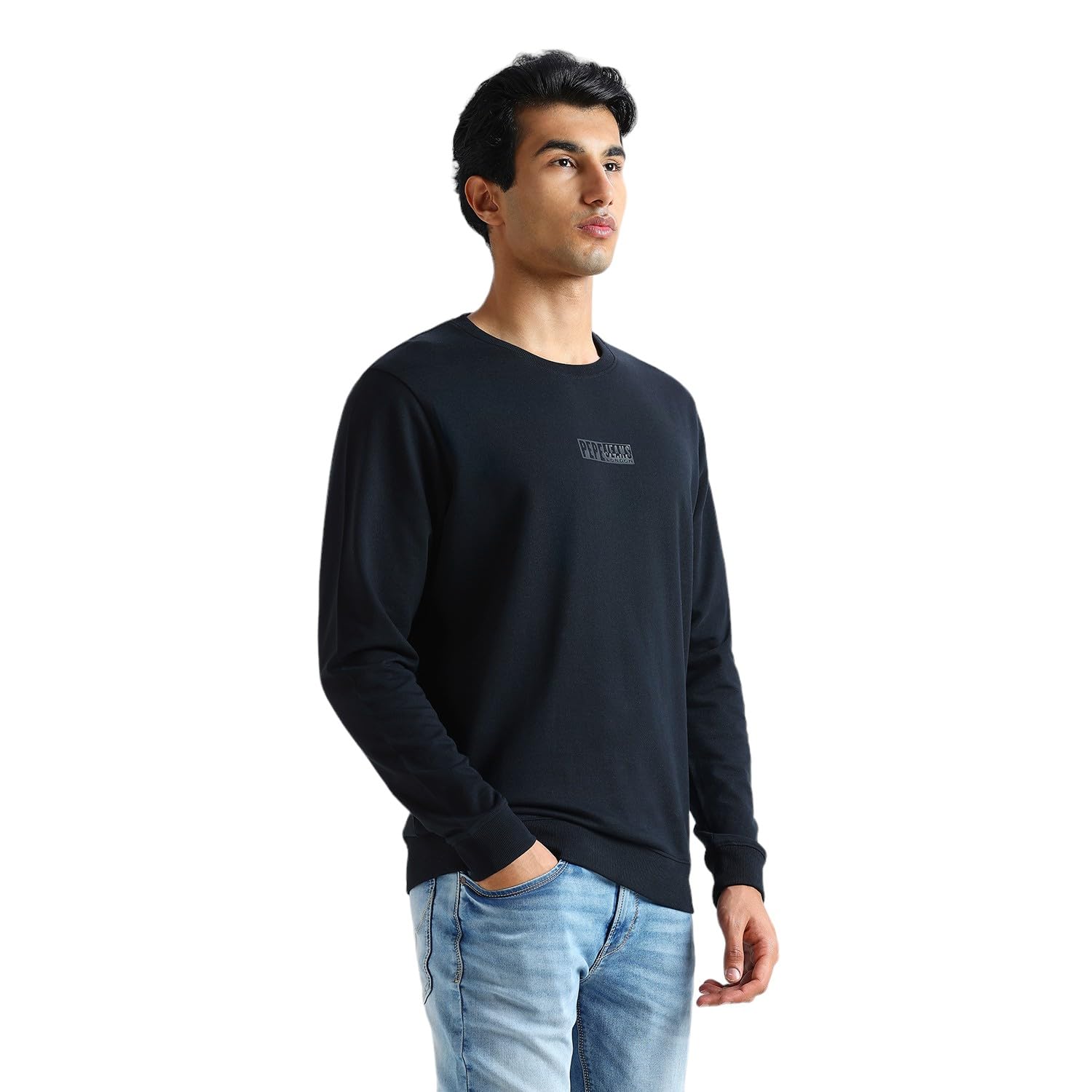 Perfect your casual look with this sleek black French terry sweatshirt for men. Crafted from soft cotton and treated with a softener wash, it offers unparalleled comfort for all-day wear. The standout feature is a subtle tonal high-density print at the chest that adds a touch of sophistication to the classic design. Full sleeves provide coverage, while the crew neck offers timeless appeal. A contrasting neck tape detail adds a pop of interest that elevates the overall look. Perfect for layering or wearing solo, this men’s sweatshirt pairs effortlessly with jeans or joggers for a stylish, relaxed ensemble.