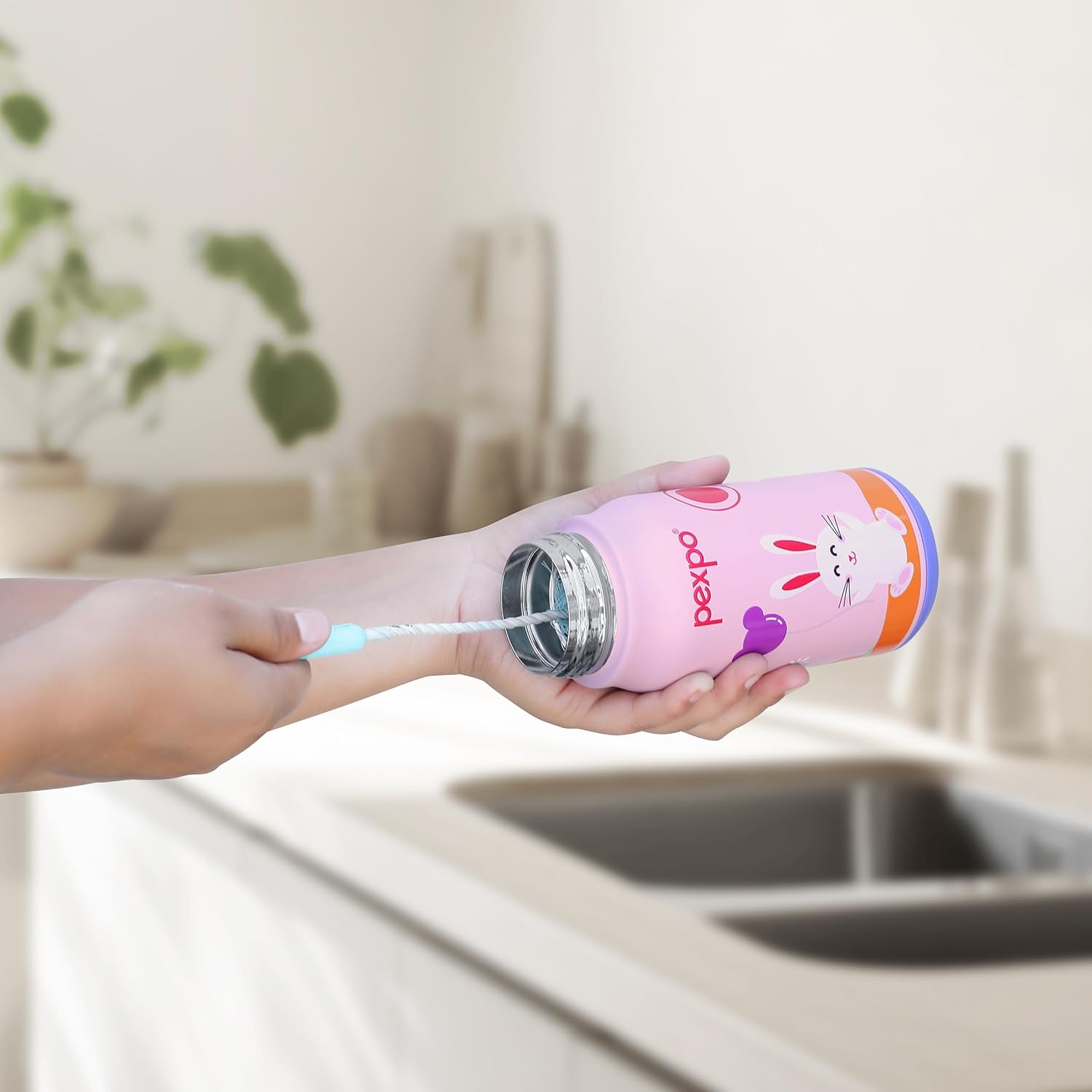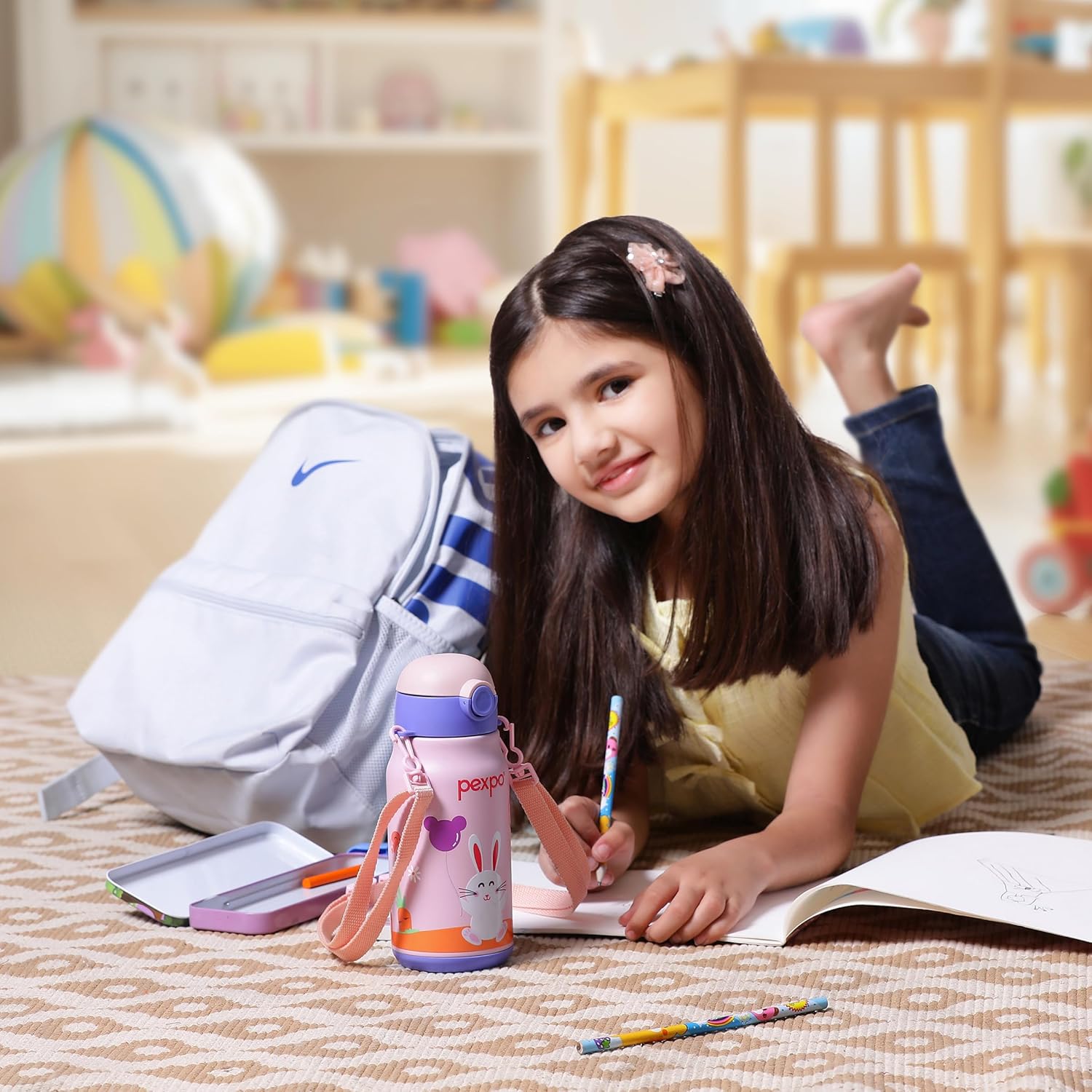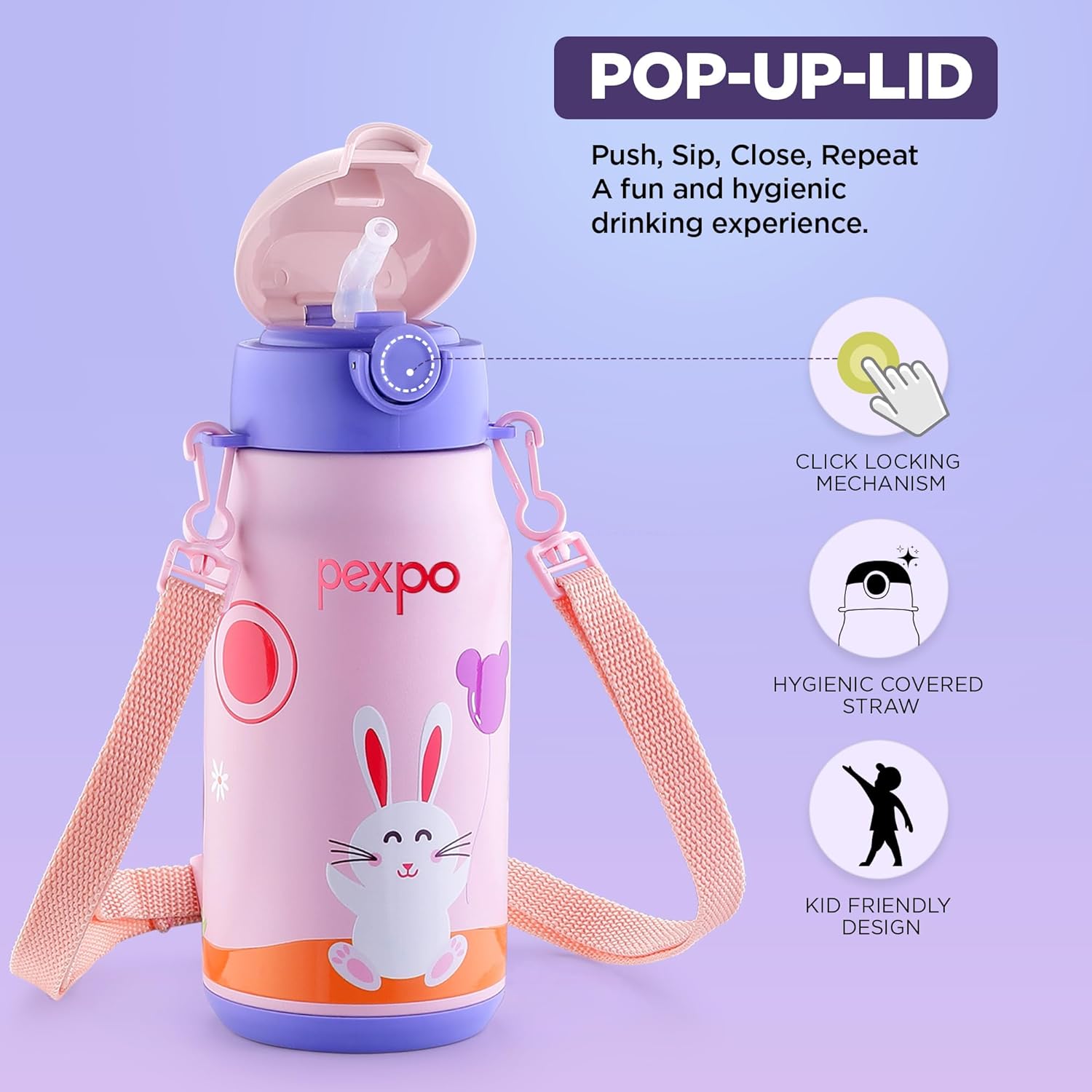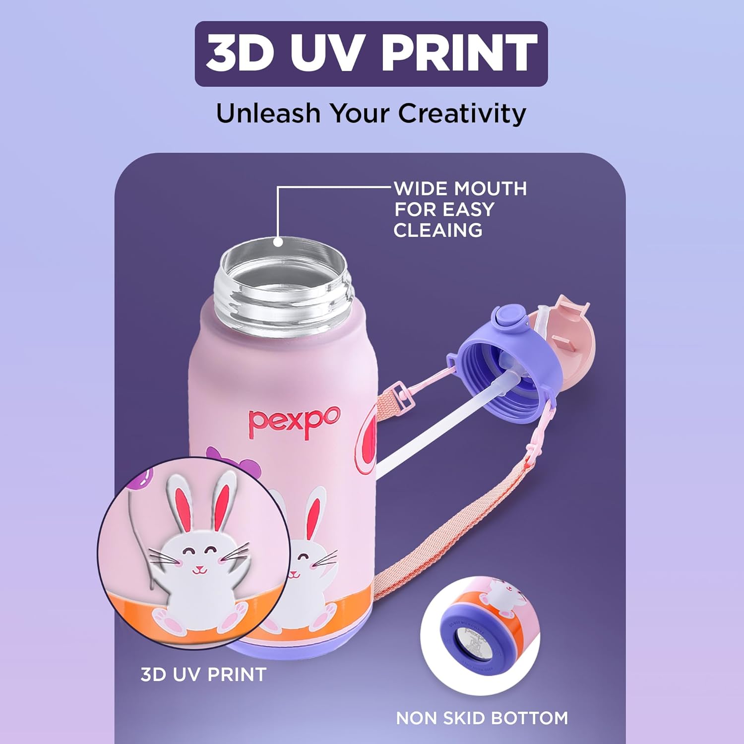 Pexpo Poggo 450 ISI Certified Stainless Steel Sipper Water Bottle for Kids 420ml Hot & Cold Flask | Vaccum Insulated Water Bottle | BPA Free | School | Picnic | Travel – Rabbit UV Printed Design