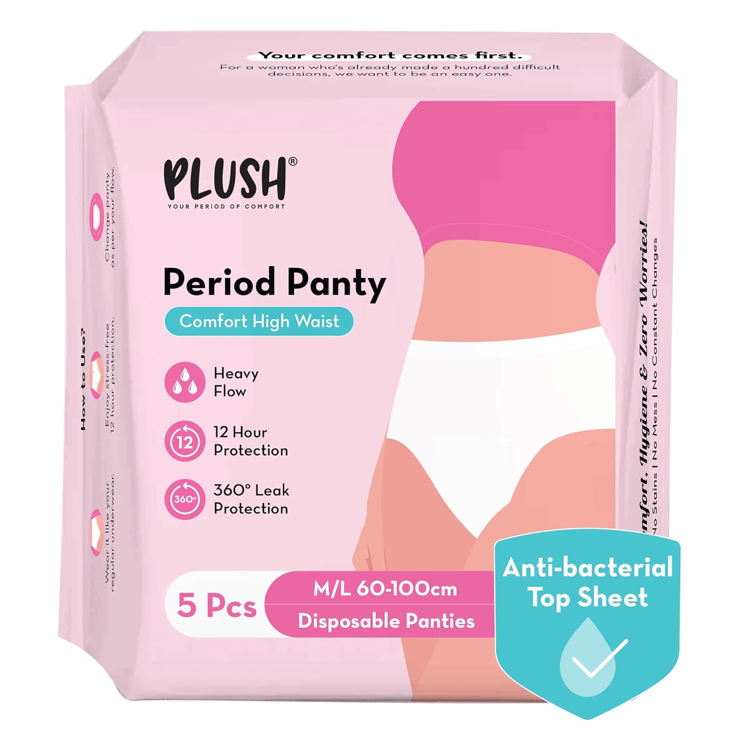Plush Comfort High Waist Disposable Period Panties for Women – 5 Pcs M/L (60-100cm) | Anti-Bacterial | 12-Hour Protection | 360° Coverage | Rash-Free | Ideal For Heavy Flow & Overnight Use | White Color