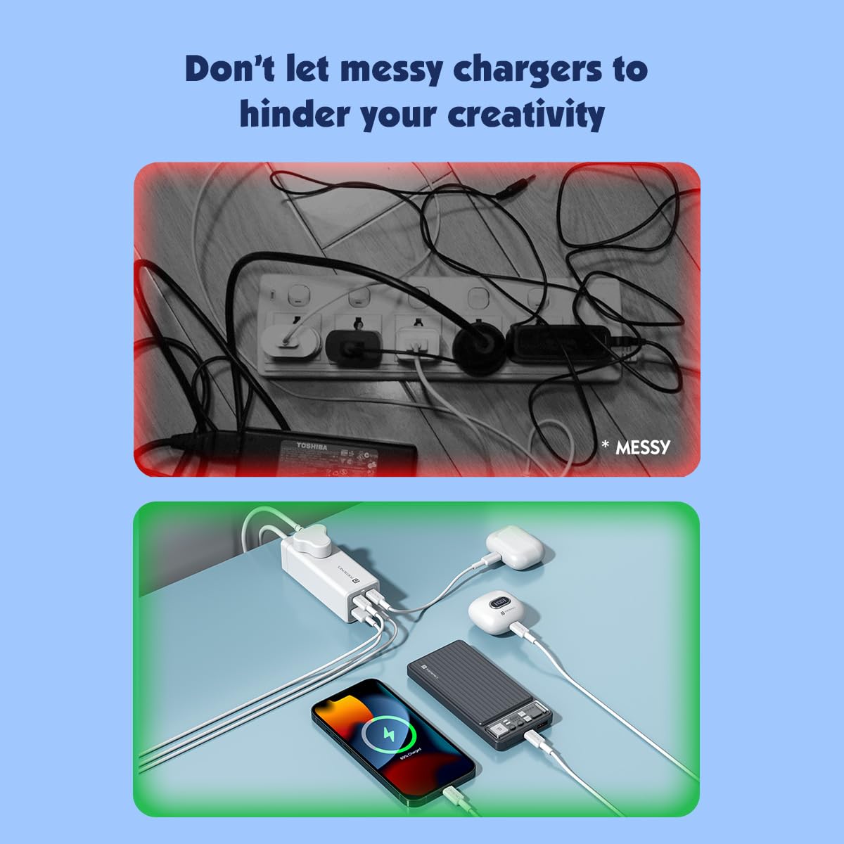 The Portronics Adapto Volt 65 is exactly what I was looking for! My main goal was to charge all my devices simultaneously with minimal cables and adapters, and this product delivers flawlessly. With two USB-C ports, two USB-A ports, and an AC power socket, it easily handles all my charging needs, whether it’s my laptop, smartphone, or power bank.The build quality and craftsmanship are top-notch, giving me confidence in its durability. I’ve placed it inside a casing, with the wires neatly coming out, and it looks incredibly tidy. This power strip has made my setup much more organized, and I couldn’t be happier with the results.Overall, it’s an awesome product that serves all my needs perfectly. Highly recommended for anyone looking for a compact, efficient, and well-designed power strip!