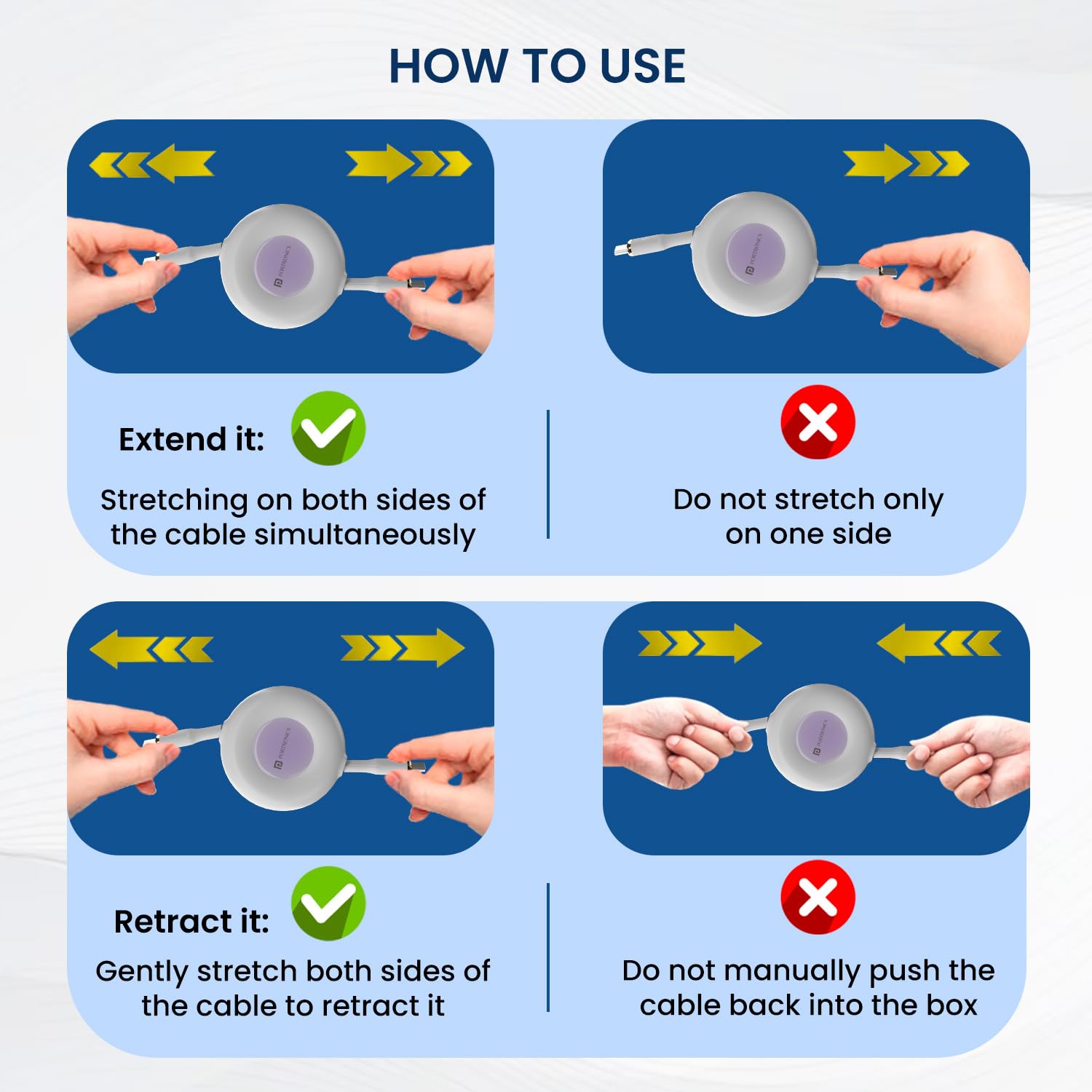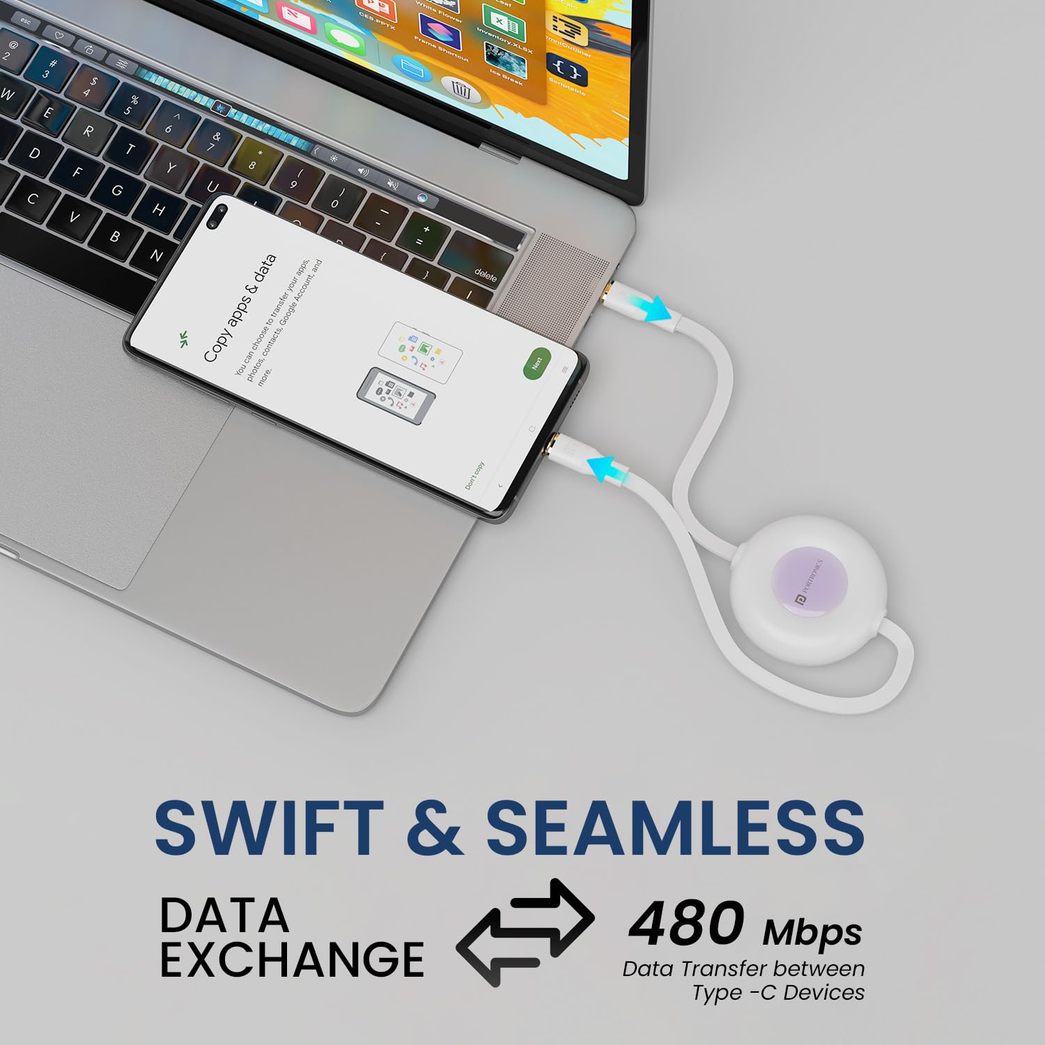 Fully Retractable Cable: Hassle-free charging with the Portronics Konnect Recoil, a retractable Type-C to Type-C cable. This cable can be extended by pulling on either side, providing ultimate convenience for charging your devices.