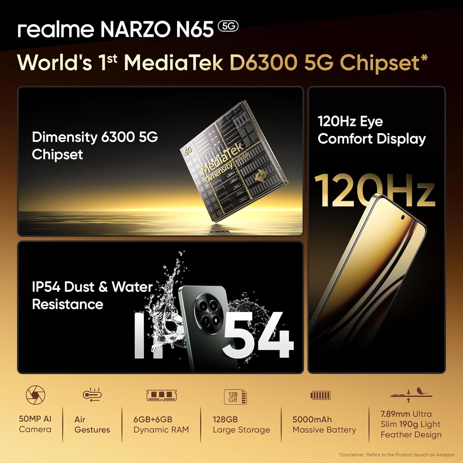 realme NARZO N65 5G (Amber Gold 8GB RAM, 128GB Storage) India’s 1st D6300 5G Chipset | Ultra Slim Design | 120Hz Eye Comfort Display | 50MP AI Camera| Charger in The Box