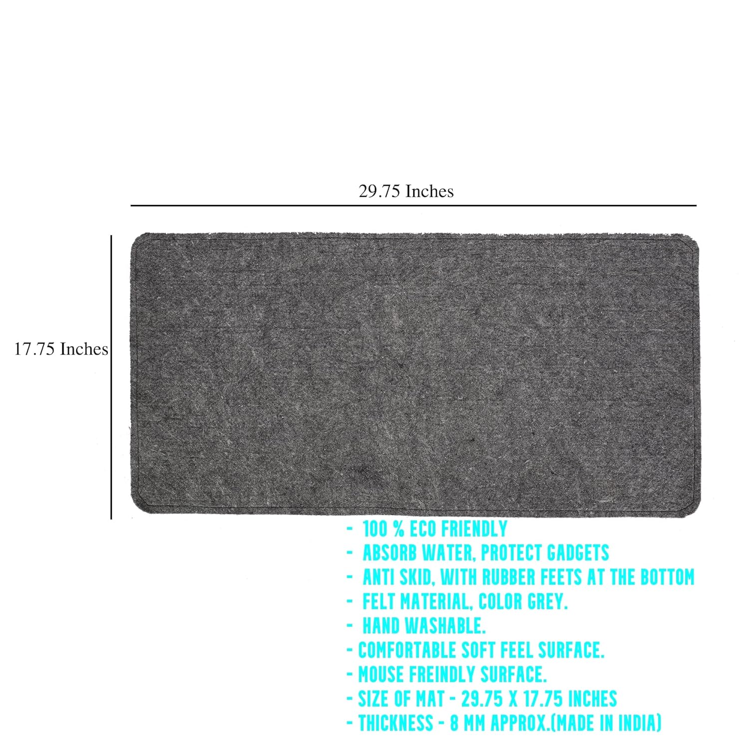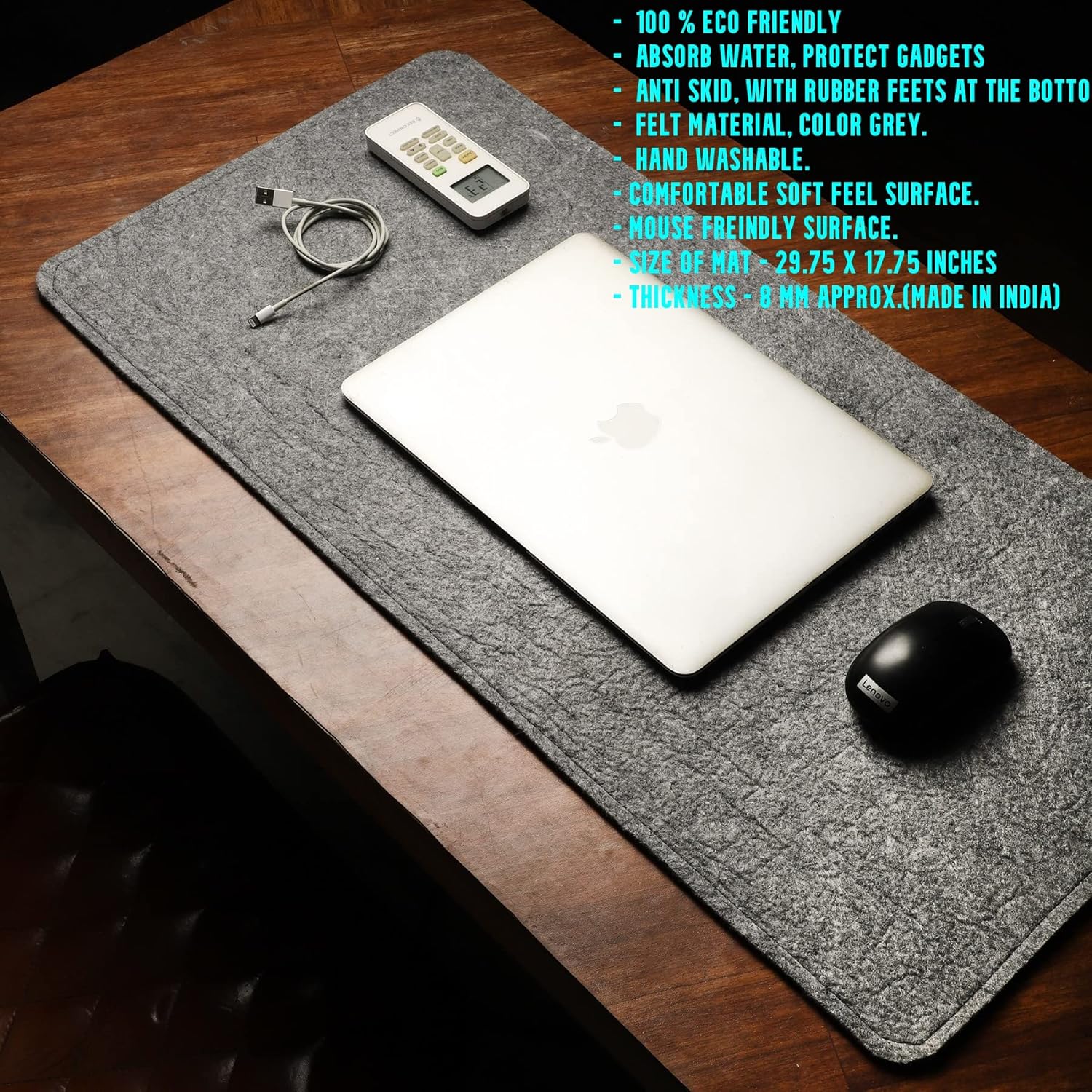 This is a great desk mat. The width, thickness and depth are apt. Quality is also looks good (atleast initially).